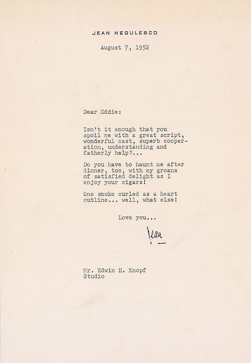Oscar-nominated film director (1900–1993) known for his classics How to Marry a Millionaire and Johnny Belinda. TLS signed “Jean,” one page, 7.25 x 10.5, personal letterhead, August 7, 1952. Letter to producer Edwin H. Knopf. In full: “Isn’t it enough that you spoil me with a great script, wonderful cast, superb cooperation, understanding and fatherly help?…Do you have to haunt me after dinner, too, with my groans of satisfied delight as I enjoy your cigars! One smoke curled as a heart outline… well, what else!” In fine condition, with subtle toning to top. The letter must refer to Scandal at Scourie, directed by Negulesco and released in 1953, as it was the only one of Negulesco’s films produced by Knopf.