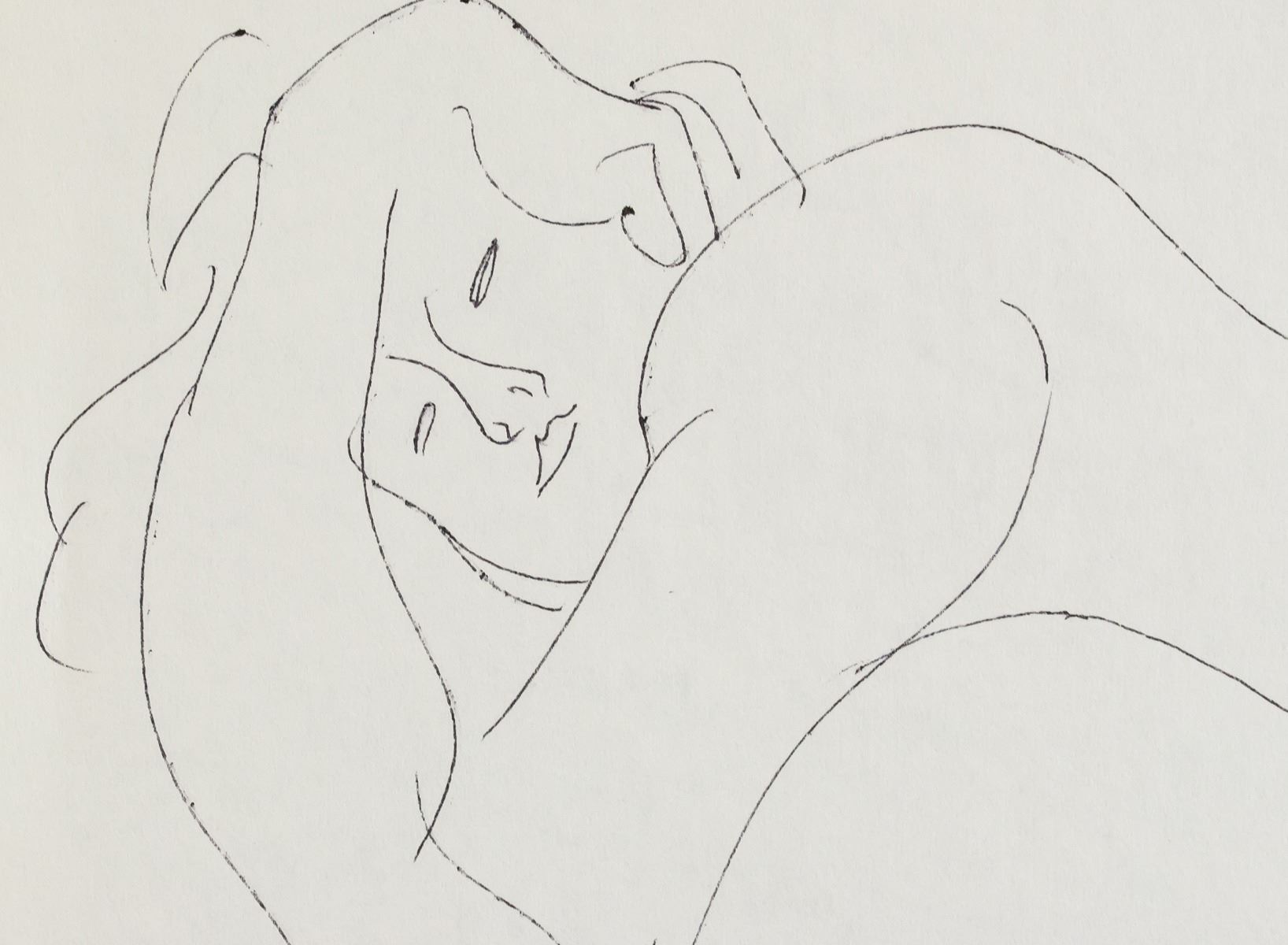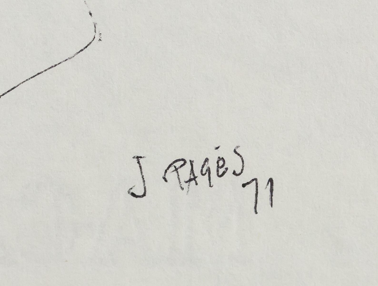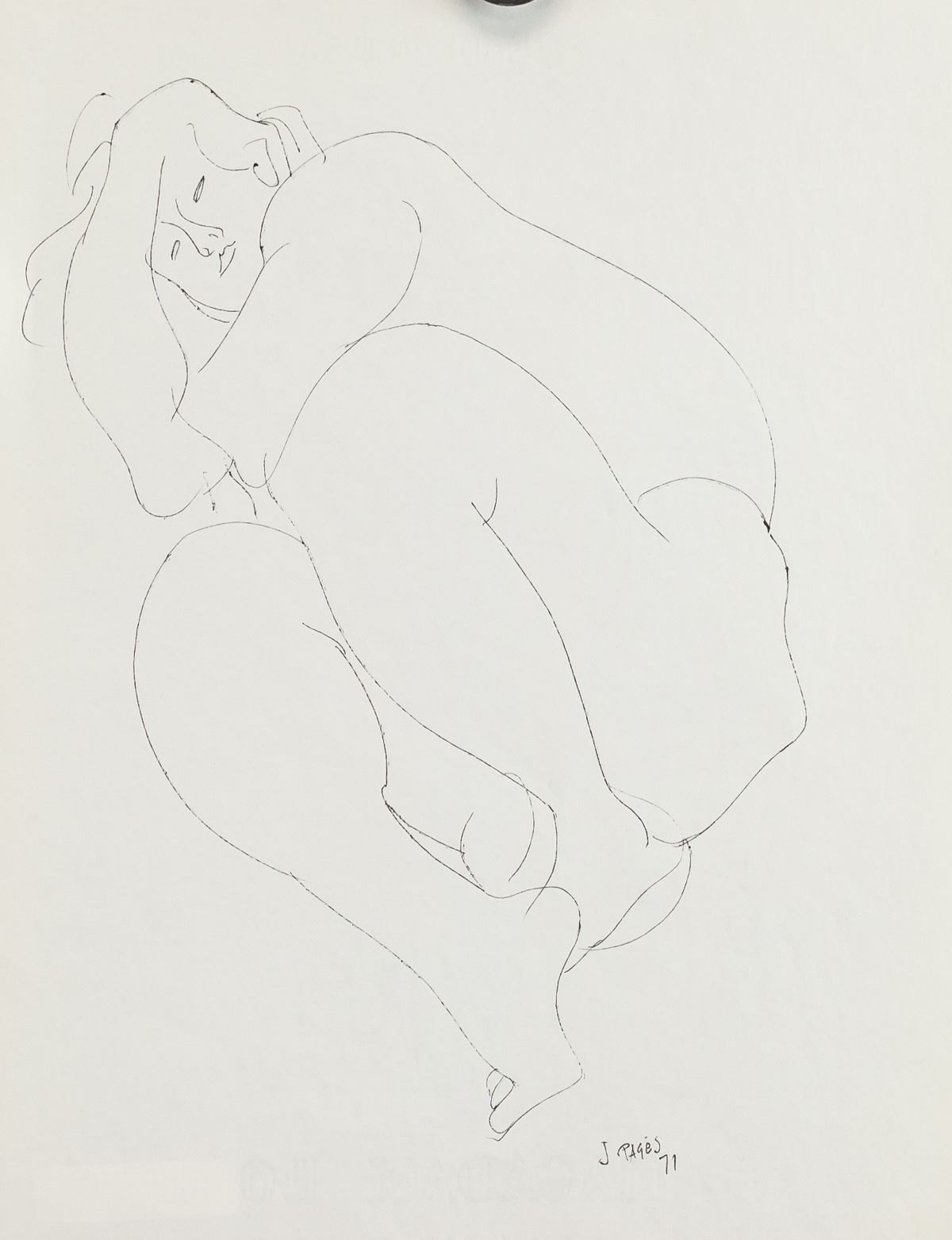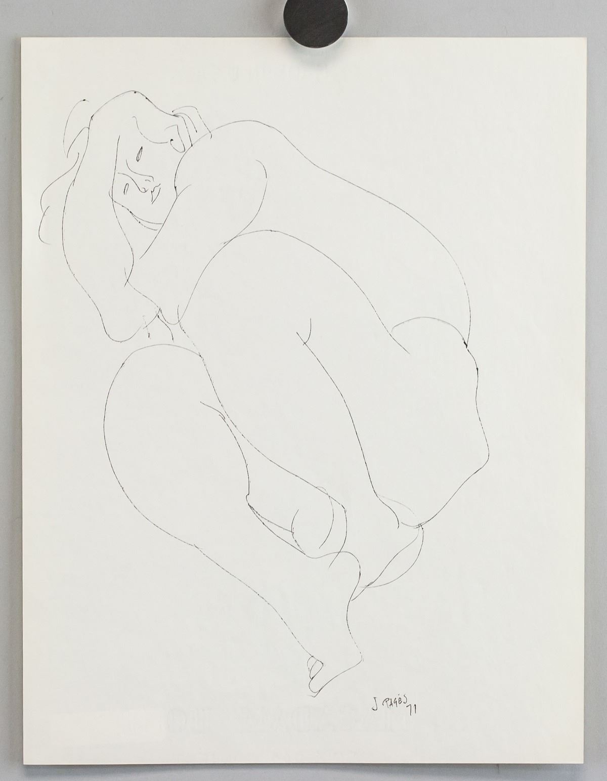 Ink on paper. Featuring nude sketch. Signed "J PAGES" to the bottom right. Inscribed with "71" beside the signature. Attributed to Jean Pages (1903-1976, French). 22 x 28 cm (8.5 x 11 in).