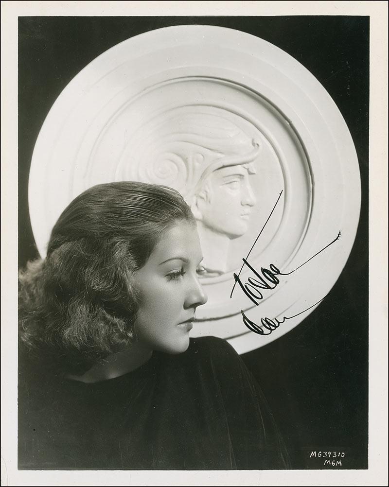 Vintage glossy 8 x 10 MGM publicity photo, signed in fountain pen. Photo is encapsulated in protective plastic sleeve. In fine condition, with some scattered light creases and surface marks. Pre-certified PSA/DNA and RRAuction COA.