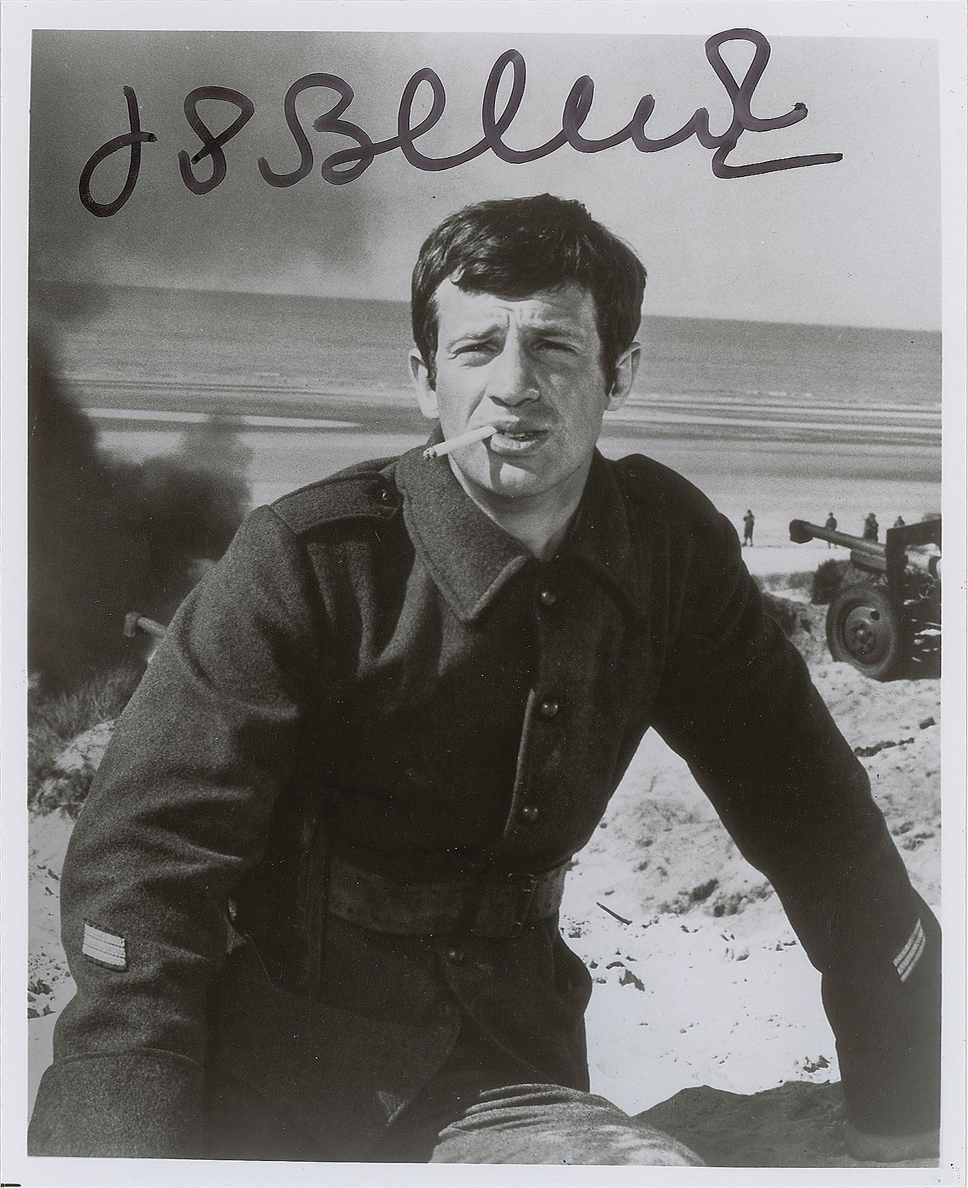 Glossy 8 x 9.75 half-length photo of Belmondo as Julien Maillat in the 1964 film Weekend at Dunkirk, signed in black felt tip, "J. P. Belmondo." In fine condition.
