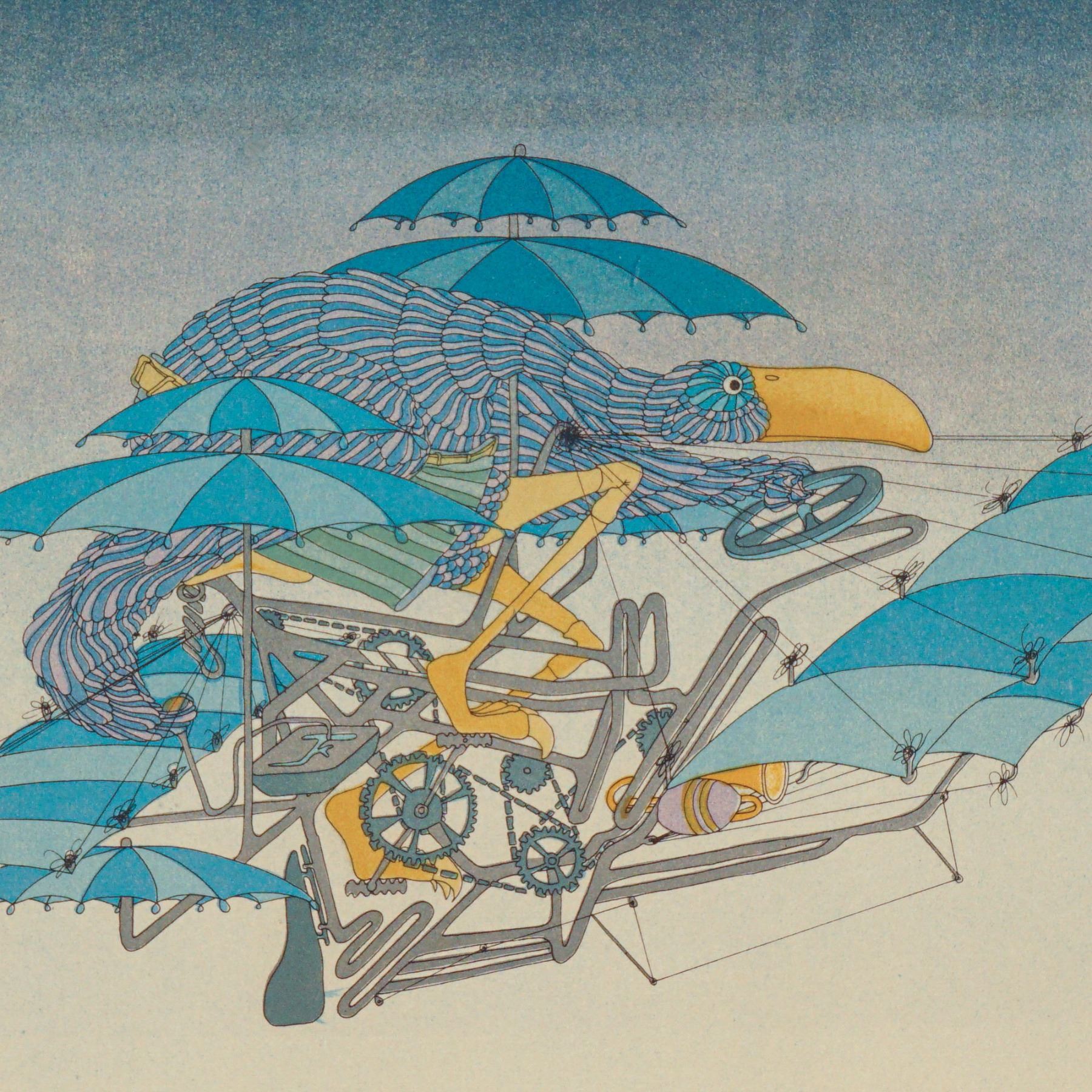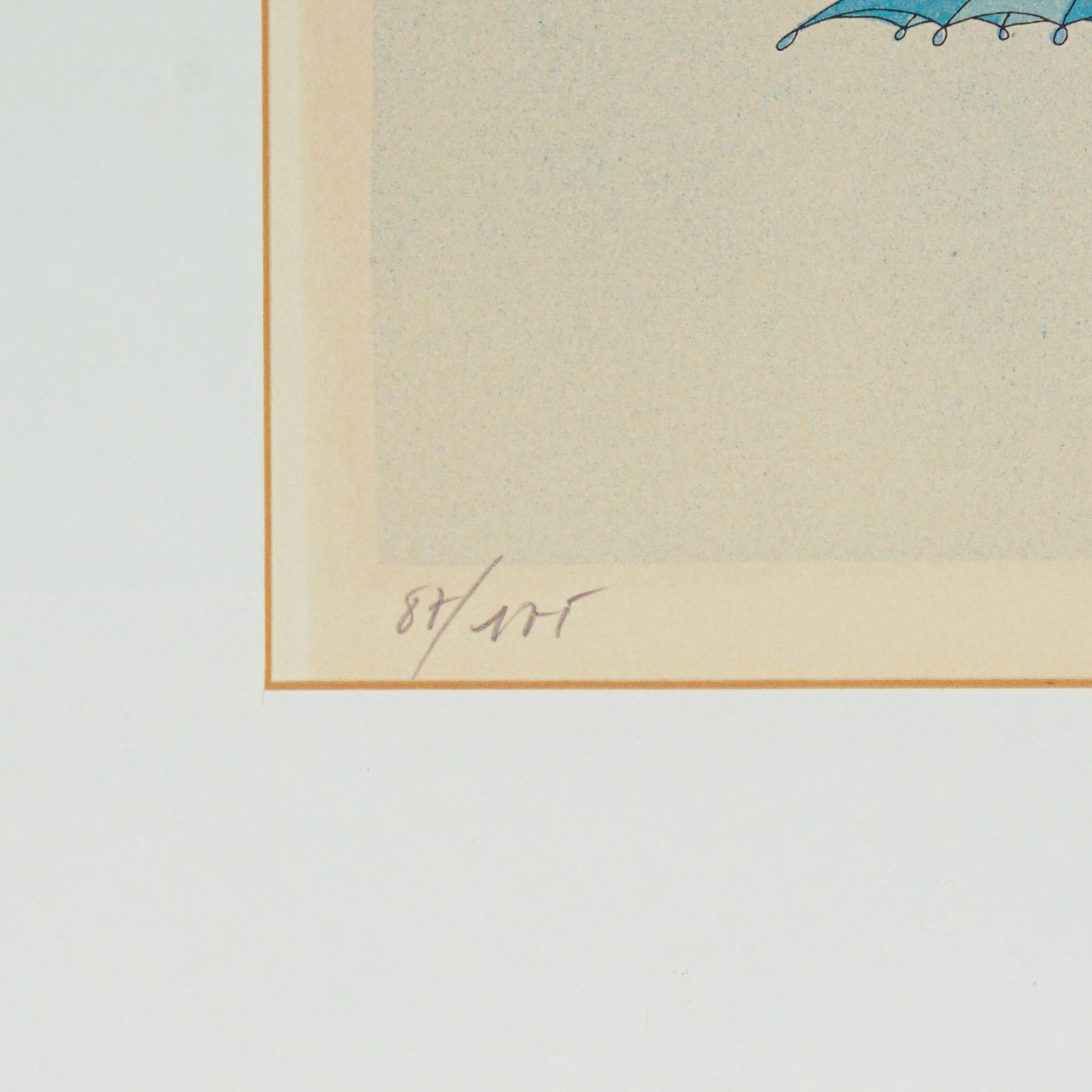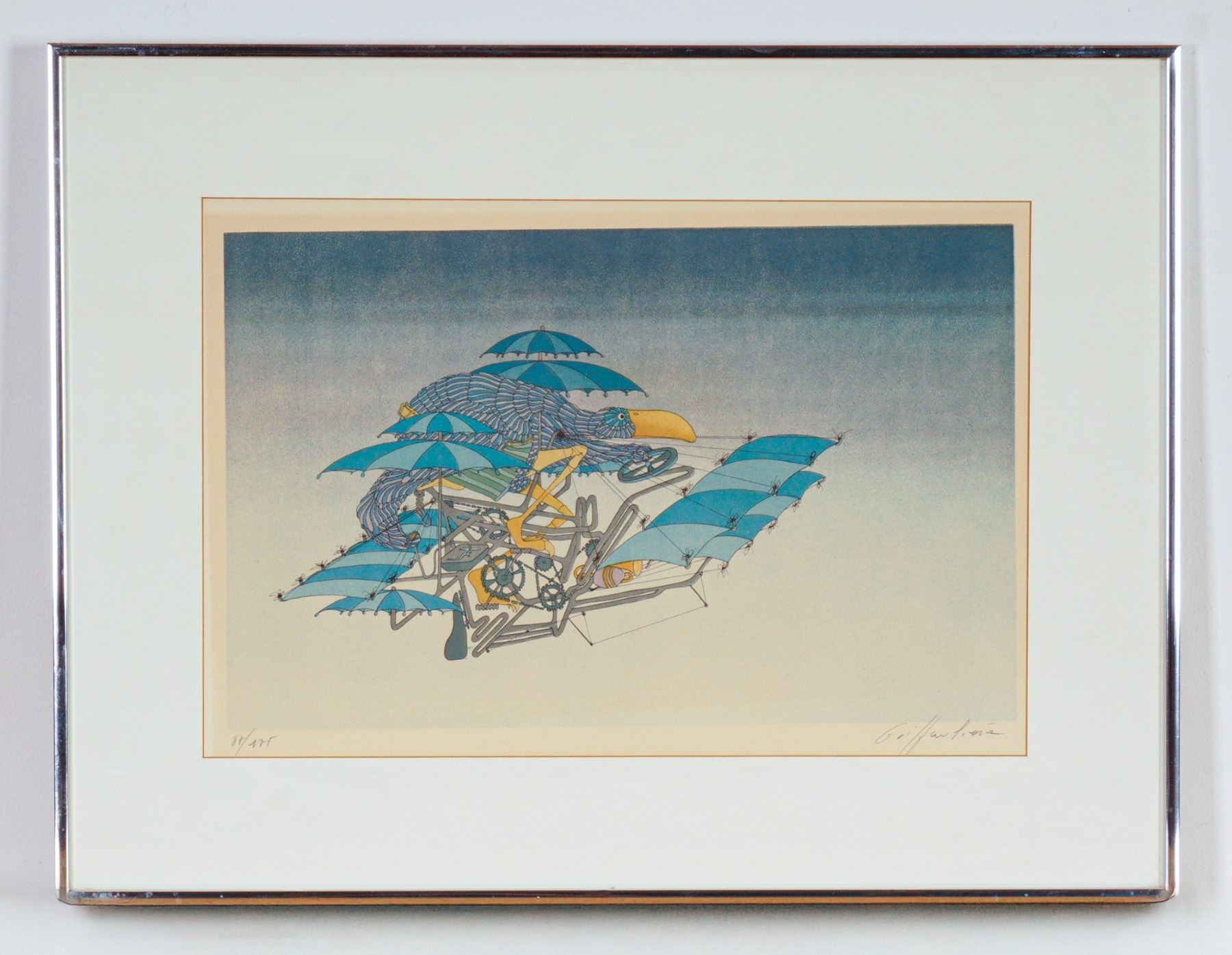 Color lithograph by Jean Paul Griffouliere, depicting a surreal composition of a mechanical bird riding form constructed from intricate gears and blue parasols set against a gradient sky. The work exemplifies Griffouliere's distinctive blend of technical precision and imaginative whimsy. Hand-signed by the artist in pencil lower right and numbered 87/175 lower left. Presented under mat in a sleek chrome frame with a wired back, ready for display.