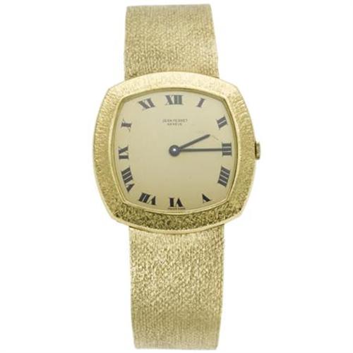 <B>Jean Perret Men's 18k Gold Integral Bracelet Wristwatch</B></I><BR><BR>Case: 36 mm, tonneau-shaped heavily textured 18k yellow gold with pressure sealed case<BR>Dial: matte finished goldtone with black Roman numerals, black "Baton" hands and mineral crystal, marked Jean Perret Geneve<BR>Movement: 17 jewels, manual wind, Swiss<BR>Bracelet: integral textured 18k yellow gold with foldover clasp on one end and bracelet extender on the other; 9 inches<BR><BR> <B>Condition Report:</B> Normal signs of wear as appropriate with age. Watch is currently in running order. Dial has minor scratches evident between 1 & 3 o'clock positions. Bracelet has damage along the edge leading up to the clasp. Very slight twist to bracelet noted. Gross weight 73.60 grams.<BR><BR><b>Shipping:</b> Miscellaneous Collectibles, Smal (<a target="_blank" href="http://www.heritageauctions.com/common/shipping.php">view shipping information</a>)