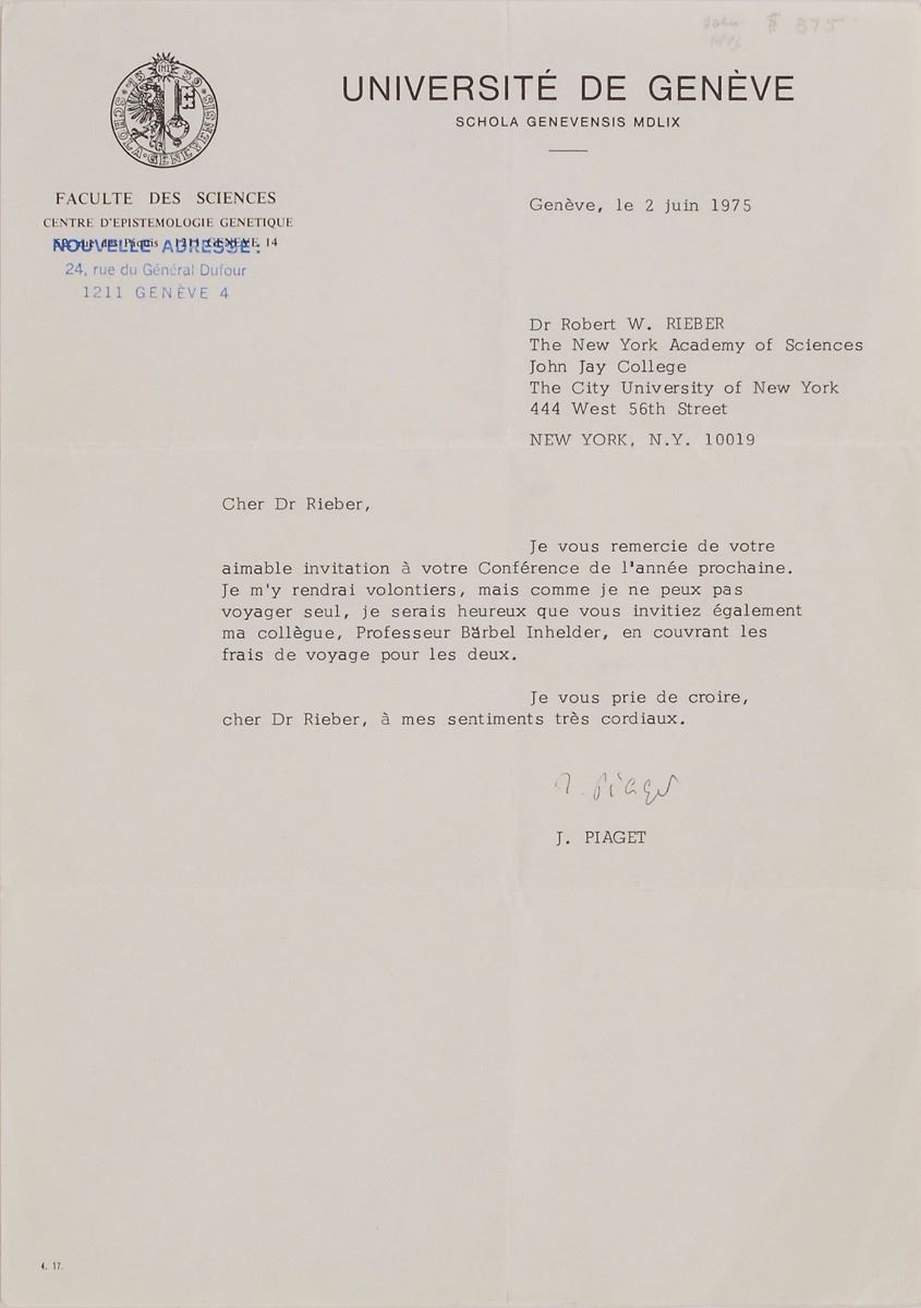 Psychologist known for his pioneering work in child development (1896–1980). Untranslated TLS in French, signed “J. Piaget,” one page, 8.25 x 11.75, University of Geneva letterhead, June 2, 1975. In fine condition.
