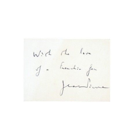 Jean-Pierre Aumont Handwritten Note & Signature - Legendary French actor Jean-Pierre Aumont garnered more prestigious awards than anyone in Hollywood. Having started a successful career in Hollywood after leaving France when the Nazi's took over in the late 1930's, he decided he had to go back and fight for his country. For his bravery in battle he was awarded the Legion d'Honneur and the Croix de Guerre by the French Government. as well as receiving, near the end of his career, the cross of Commandeur des Arts et des Lettres, and a César Award (the French Oscar). He was known for his incredible stage work, as well as starring in many French classic motion pictures, as well as such American iconic films as "The Devil at 4 O'clock" with Frank Sinatra and Spencer Tracy and Sydney Pollack's "Castle Keep". He is perhaps best known for his hauntingly autobiographical portrayal of an aging French actor in François Truffaut's magnificent love poem to movie making, "Day for Night". He was close friends with many of Hollywood's elite, including Van Johnson and his wife Evie. This is a rare handwritten note from Aumont which occupied a basket of expensive French Wines and cheese to celebrate Van's 40th birthday in 1956. In his handwriting he has inscribed: "With the love of a Frenchie fan-Jean Pierre Aumont". Being a rather private man, who liked the peace of the rural world, notes, or autographs of this actor-hero are quite rare. This comes directly from Van Johnson's personal collection, and includes a Letter of Provenience from the Johnson’s daughter, Schuyler Johnson along with a copy of her famous controversial cover story article “My Life As A Hollywood Princess”, about her trials and tribulations growing up in Beverly Hills with a superstar father and extended “family” with some of the most famous celebrities in the world.
