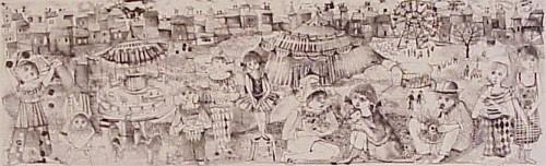 CIRCUS PERFORMERS, color lithograph, signed in pencil, from the numbered edition 80, image 8 ¼ x 27”, full margins, soft creases. $100/200