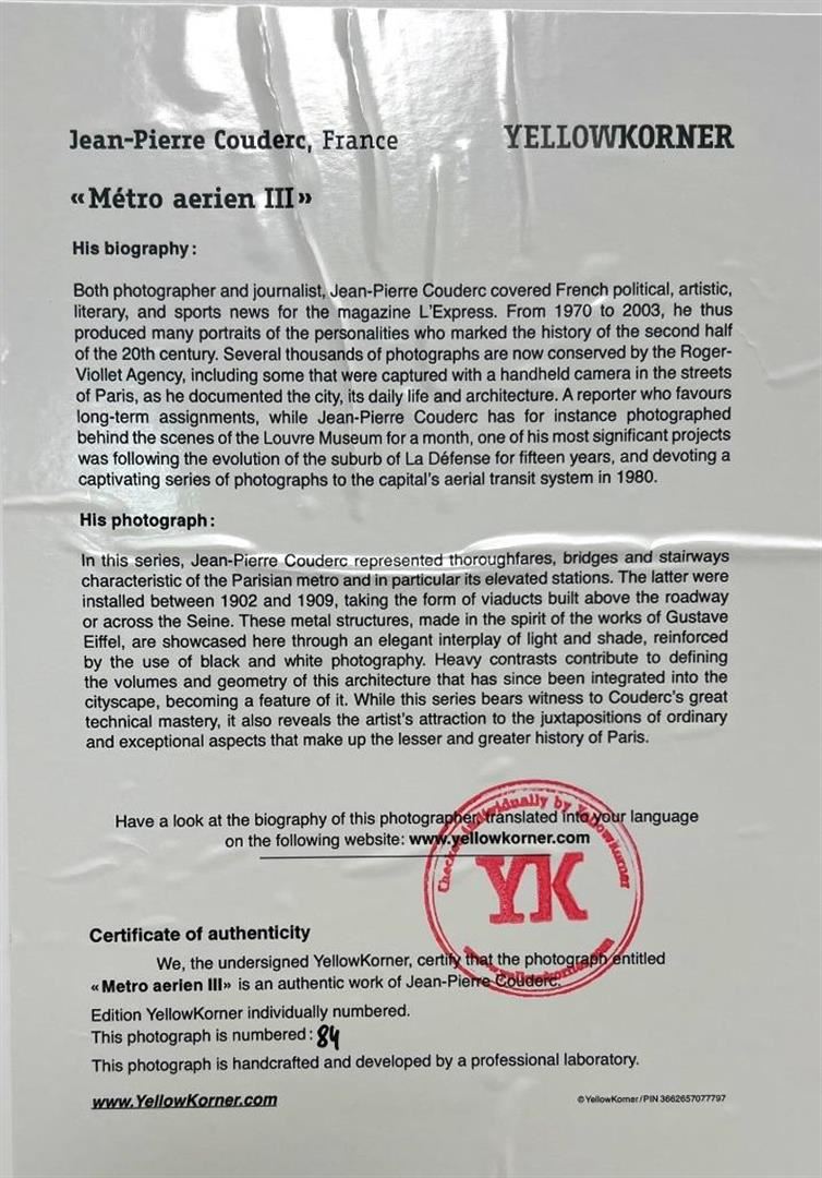 Jean Pierre Couderc France Metro Aeiren III YellowKorner Certified Photograph. Certificate of Authenticity from YellowKorner affixed to the back. Matted Dimensions 16"x20". Protected with Clear Mylar Sleeve.
