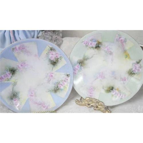 Jean Pouyat tea plates factory painted in random clusters of pink roses, leaf and trailing vine and bordered with a geometric shaped frame of tiny enameled bead work. Both plates exhibit the same florals motif, however each differ with their enameled bead pattern and border colors.<BR><BR>One has a pastel blue border with a tinged pale yellow squared six "petal" shape framed with enameled beads. The other is washed with a pastel green border and framed with enameled beading in the shape of "circle and spoke" on matching pale yellow. Both are highlighted with a fine burnished gold plate rim.<BR><BR>These plates were once part of a wonderfully detailed tea/dessert service. Both plates measures 7.75 inches in diameter and are rated to be in very fine condition.<BR><BR>J.P.L Mark 5, circa 1890 - 1932.<BR><BR>