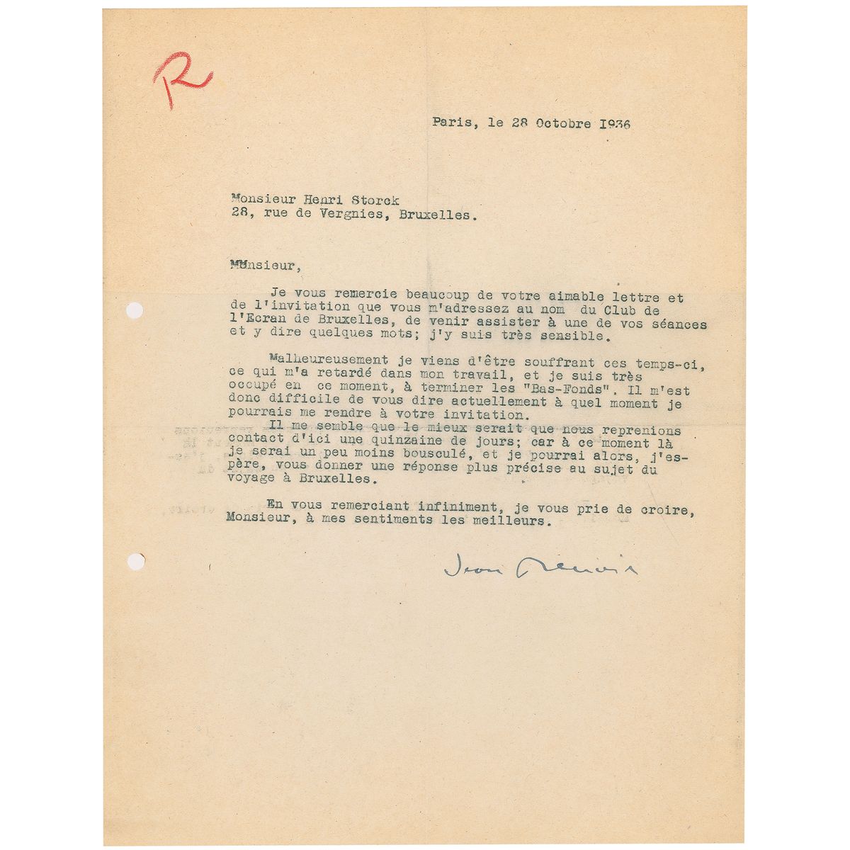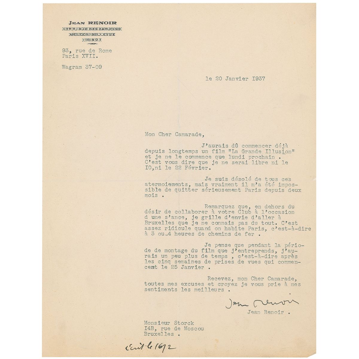 Distinguished French director (1894–1979) whose 1939 classic Rules of the Game takes a place among the most acclaimed films ever made. Two TLSs in French to author and filmmaker Henri Storck, each one page, dated October 1937 and January 1937. The first, in part (translated): “I should have long started filming 'La Grande Illusion' already and I do not start until next Monday.” The second, in part: “Notice that, apart from the desire to work at your club during a session, I burn with desire to go to Brussels…This is pretty ridiculous when you live in Paris, that is to say three or four hours of railways.” Also includes an ALS from Belgian screenwriter Spaak to Renoir, in part (translated): “Old traitor…you stole three quarters of my copyright…your paper was disgusting lousy you gave them the rights to ‘La Grande Illusion’ for ten years.” Both letters are affixed at the top to other sheets. Intersecting folds and uniform toning, otherwise overall fine condition. La Grande Illusion is regarded by critics and film historians as one of the masterpieces of French cinema and among the greatest films ever made.