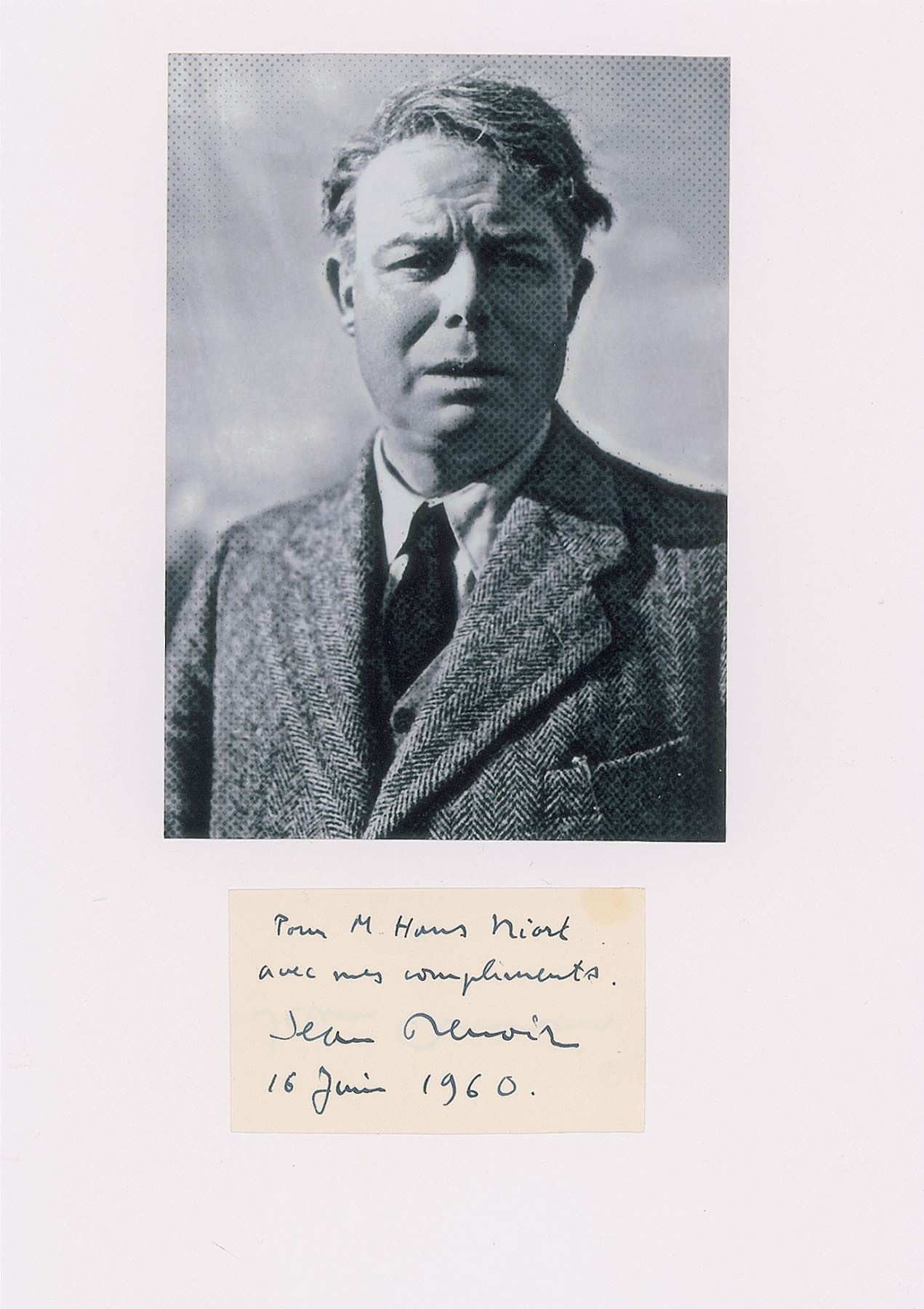 Vintage fountain pen signature and inscription, "Pour M. Hans Niort, avec mes compliments, Jean Renoir, 16 Juin 1960,” on an off-white 3.75 x 2.25 slip affixed below a portrait to an overall size of 8.25 x 11.75. In fine condition.