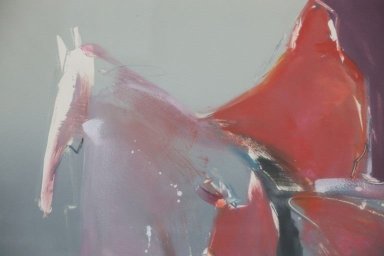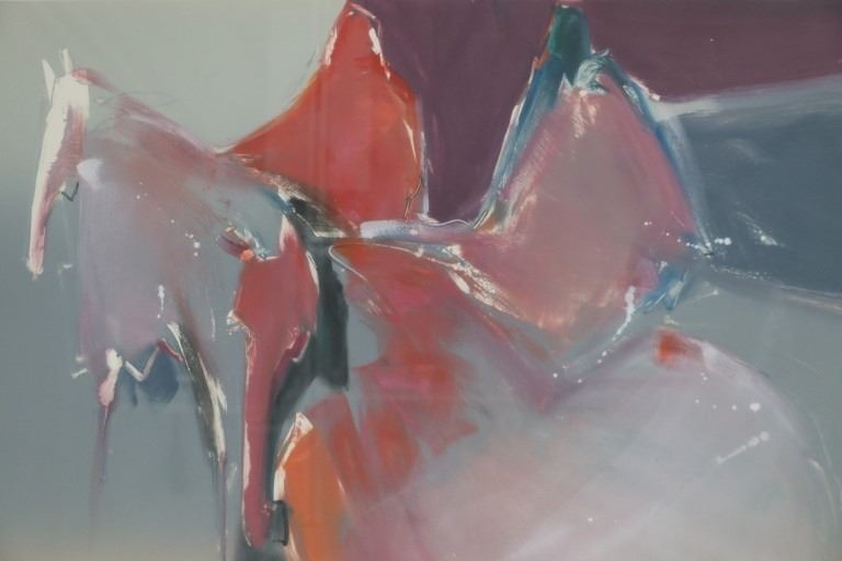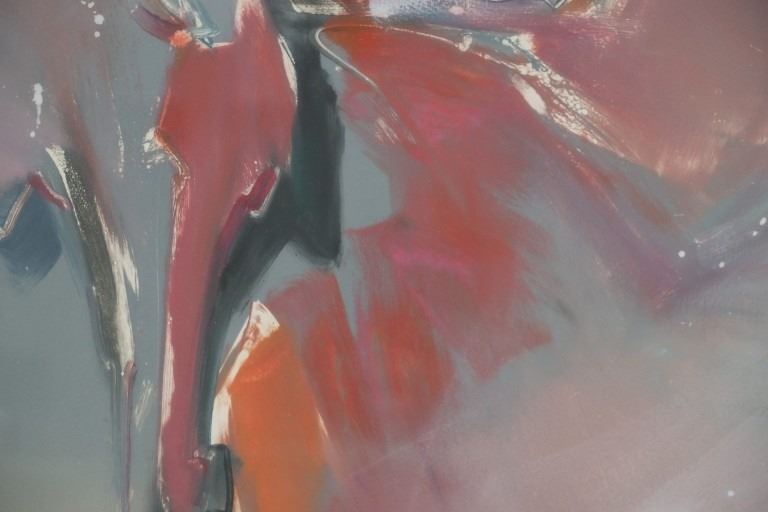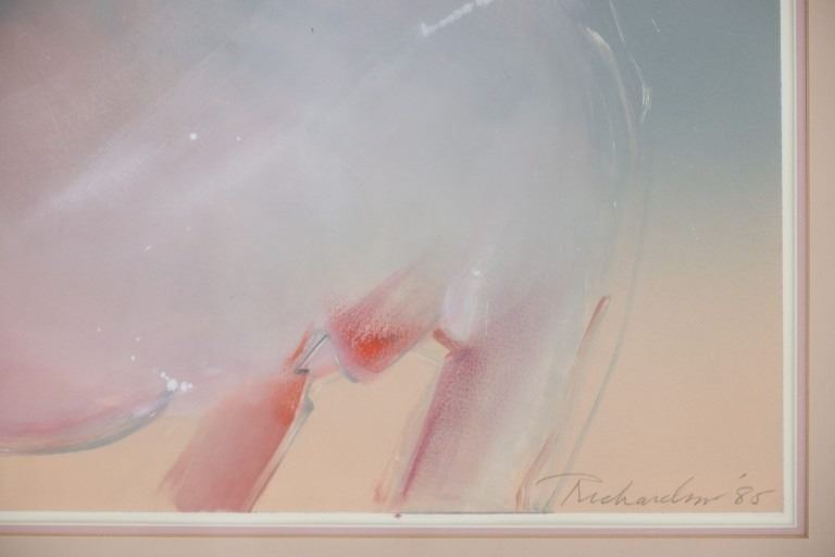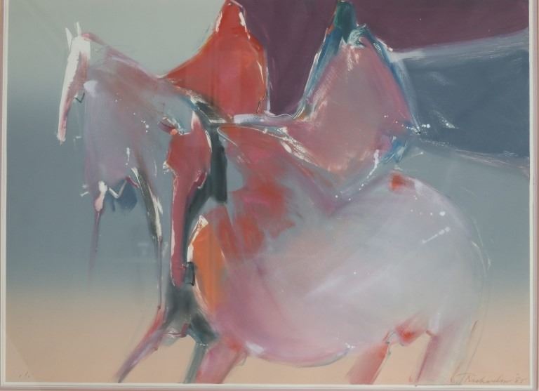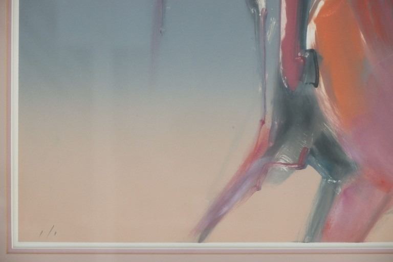 Featured in this lot is this beautiful, original limited edition painting done by renowned American artist Jean Richardson (1940-) in 1985. Jean Richardson, a painter and printmaker, was born in Hollis, Oklahoma, in 1940. She is best known for her big, abstract paintings of horses in jewel tones and rich clay hues. This original painting is a limited edition numbered 1 / 1. It shows an abstract view of two figures riding horses. The painting shows colors of red, red / brown, purple, pink, blue, orange, light blue, dark blue and maroon throughout the piece. It is numbered in the bottom left in pencil reading, "1 / 1" and is signed by the artist in pencil in the bottom right hand corner reading, "Richardson '85". The piece is set in a dark wood frame, sits behind glass and has been doubled matted with beige matting paper. It shows good condition overall with little to no wear present and no signs of damage is noted. The visible artwork measures 22" L x 29 3/4" W, while the entire piece measures 31 3/4" L x 39 1/8" W x 1 1/2" D. It has a total weight of 13 pounds and 8 ounces.