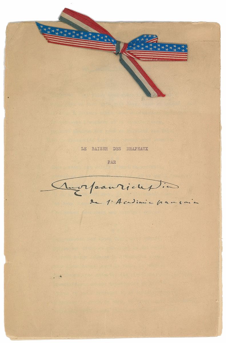 French poet, novelist, and dramatist (1849–1926). Untranslated typescript of the poem “Le basier des drapeaux,” six pages, 8 x 12, boldly signed on the cover sheet in black ink. Bound at the top with red, white, and blue ribbons. Overall toning, light soiling, and chipping to edges, otherwise fine condition. Provenance: The Everett Fisher Collection.