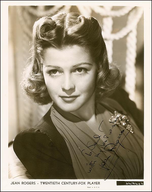 Vintage glossy 8 x 10 20th Century Fox publicity photo, signed and inscribed in-person in fountain pen “To Saul – with my best wishes, Jean Rogers.” Reverse of photo bears collector’s stamp date of May 2, 1942, the date the signature was acquired. In fine condition, with a few scattered light surface dings. The Saul Goodman collection.