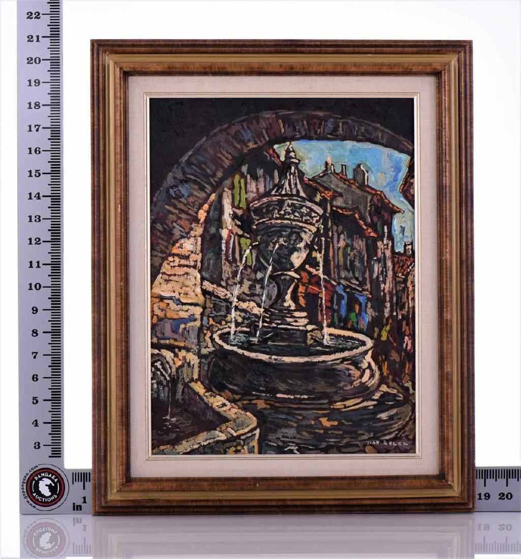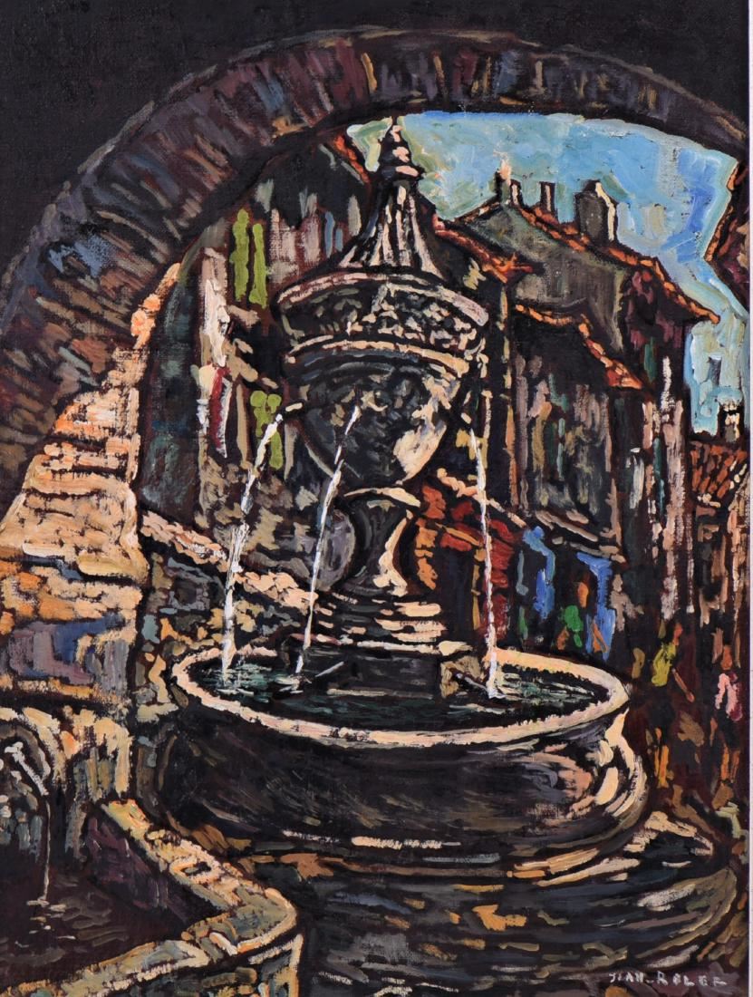 Jean Roler, Post Impressionist Oil On Canvas Painting Of A European Water Fountain Street Tunnel Scene. Framed And Matted. Estimated more than 50 yrs old. Fine Art. Size and/or Weight: See Measurement Photo. (Photos Represent The Lot Condition. Read T&C's)