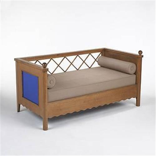 Jean Royere Croisillon daybed France, c. 1948 oak, upholstery, glass 65"w x 33"d x 29.5"h This daybed incorporates the ball and sinusoidal elements commonly utilized by Royere and the cross-hatch, linear details of this bed reflect his sense of style that combined refined decoration with simple forms.