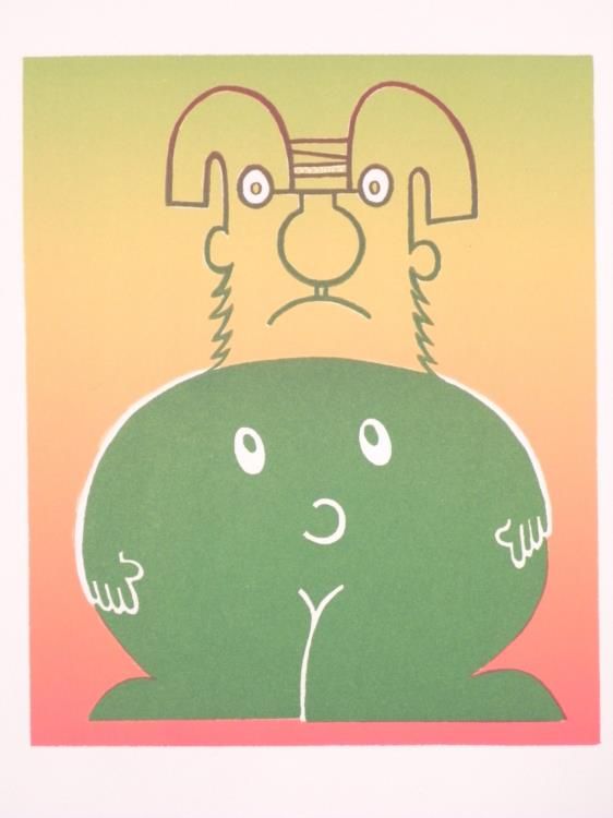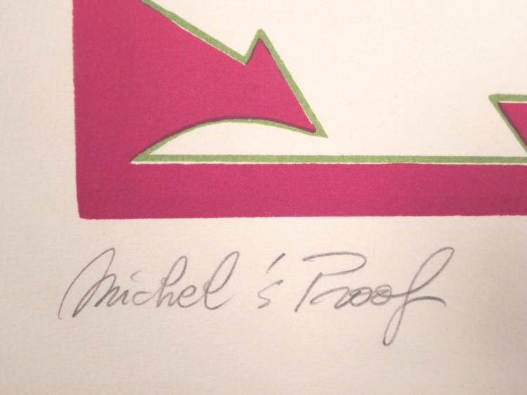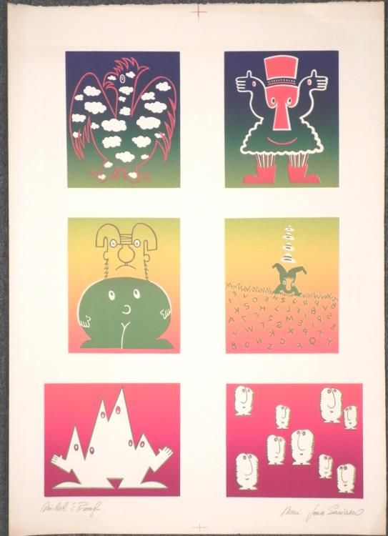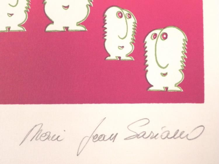 This art print features some fun and original characters, each unique and engaging. Artist: Jean Sariano (name spelling undetermined) Signature: "Merci, Jean Sariano" in pencil, lower right Title: "Six Prints" Year: 1979 Medium: Serigraph on rag paper, with printers marks at the top and bottom edge Edition: Unnumbered dedicated artist proof, marked in pencil lower left "Michel's Proof" Sheet size: 35 x 25 inches Condition: Very good, slight crease upper right margin, light margin scuffs Biography:Jean Sarian (1943- ) studied at the School of Beaux-Arts of Oran, the School of Beaux-Arts of Clermont-Ferrand, the School of Beaux-Arts in Paris, Pratt Graphic Center, New York, and the Printmaking Workshop, in New York in 1970. He developed a modern style of pop characters, full of humor and bright colors that look very contemporary today. Jean Sariano has participated in many group exhibitions at universities, galleries and museums in the United States and Europe. Some of these include the Salon des Arts Boubonnais, Vichy, France, the Quatrieme Biennale de Paris, Museum of Modern Art, Paris, 1965: "Atelier Chastel", at the Maison des Beaux-Arts, Paris, the Biennale Internationale de l'Estampe, Musee Galiera, Paris 1973, the Symosium de Hecho in Spain. We are pleased to present from an estate a group of dedicated artist proofs.
