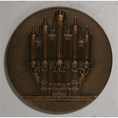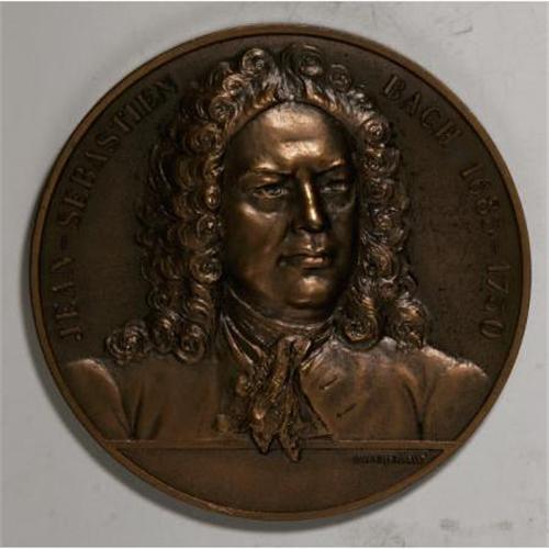 <B>Jean-Sebastien Bach 1685-1750.</B></I> Bronze, 50 mm. Obverse: facing bust of Bach by Goudray. Reverse: ornate cathedral, engraved by Em. Lindauer. A Paris Mint restrike with cornucopia and BRONZE on edge. The obverse has minor carbon. A VG round maroon cardboard holder accompanies.<BR><BR><b>Shipping:</b> Coins & Currency (<a target="_blank" href="http://www.heritageauctions.com/common/shipping.php">view shipping information</a>)
