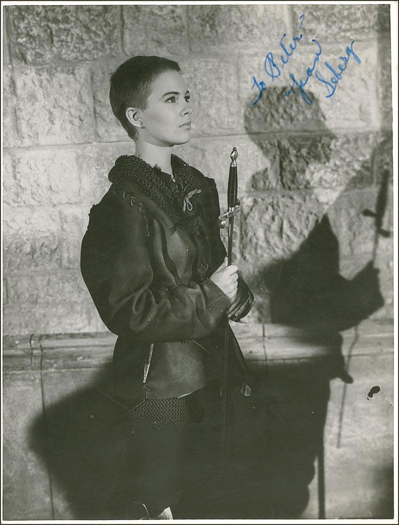 Perhaps best remembered for her role in Jean-Luc Godard’s seminal New Wave classic Breathless, Iowa-born Seberg (1938–1979) was found dead at the age of 40 from a probable suicide by barbiturate overdose. Her support of the Black Panthers attracted the attention of the FBI, leading to speculation that her radical political ties contributed to her decision to take her life. Vintage glossy 6.5 x 8.5 photo, signed and inscribed in fountain pen “To Peter—Jean Seberg.” In fine condition, with light diagonal crease passing across her leg, and a few other scattered creases and surface marks.