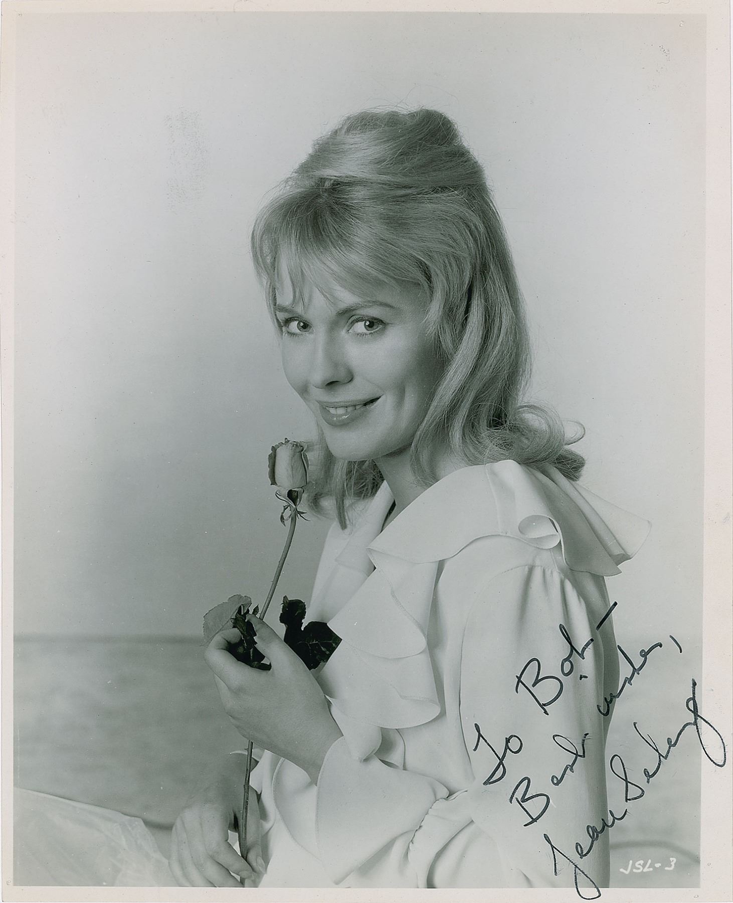 American actress (1938–1979) who is best known for the film Breathless and who later became a French New Wave icon; her death at the age of 40—ruled a 'probable suicide' by Parisian police—may have been the result on an ongoing campaign against her by the FBI's COINTELPRO project. Glossy 7.75 x 9.5 half-length photo of the lovely Seberg holding up a rose, signed and inscribed in black felt tip, "To Bob—Best wishes, Jean Seberg.” In fine condition, with trimmed edges and pin holes to the corners.