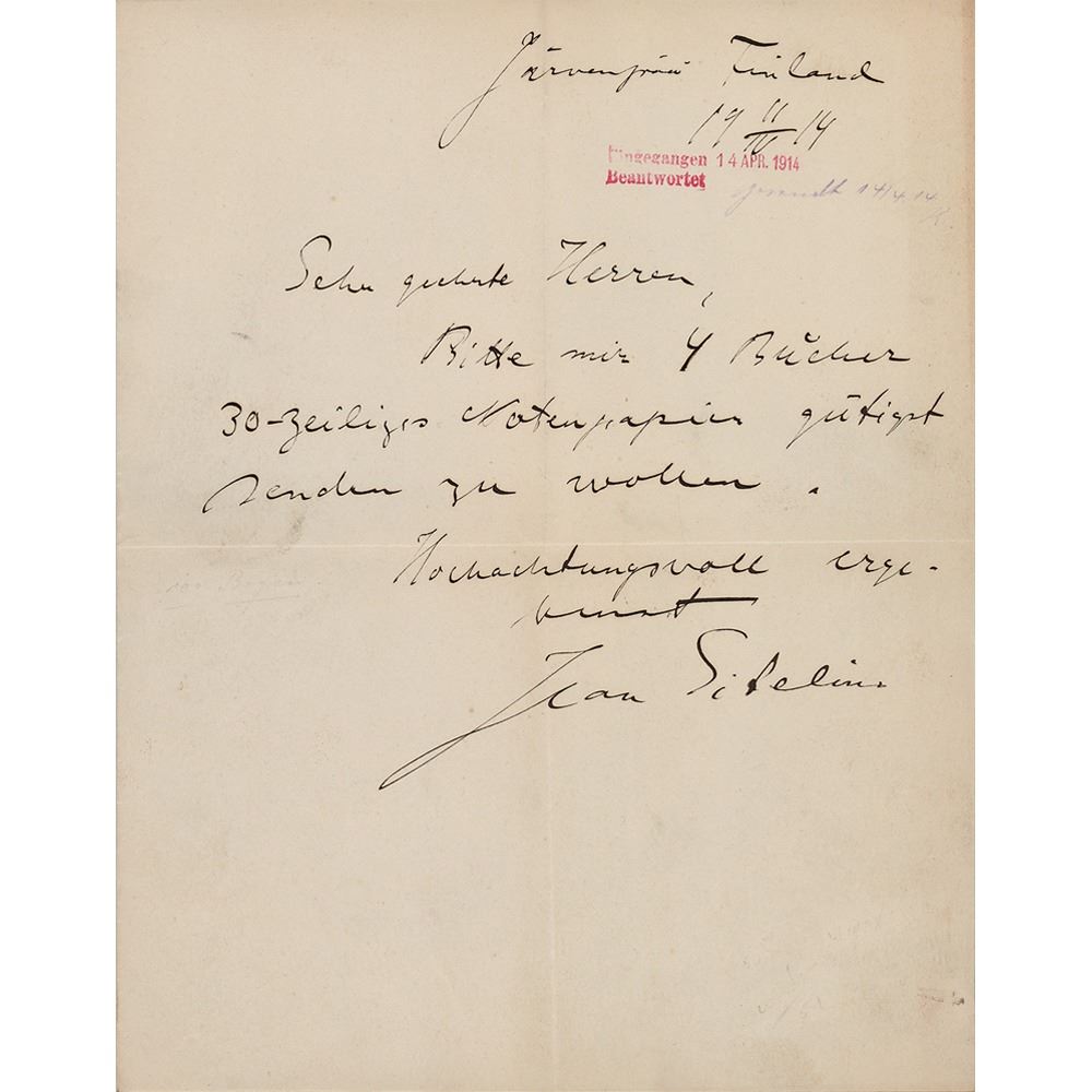 Distinguished Finnish composer (1865–1957) of Romantic-nationalistic tendencies, best known for his seven completed symphonies and the tone poem Finlandia. Scarce ALS in German, one page, 8.75 x 11, April 11, 1914. Addressed from Jarvenpaa, Finland, a handwritten letter from Jean Sibelius to a local music supplier, in full: “Very good gentlemen. Please kindly send me 4 books of 30-line music paper.” In fine condition. Handwritten letters from Sibelius are not commonly found.
