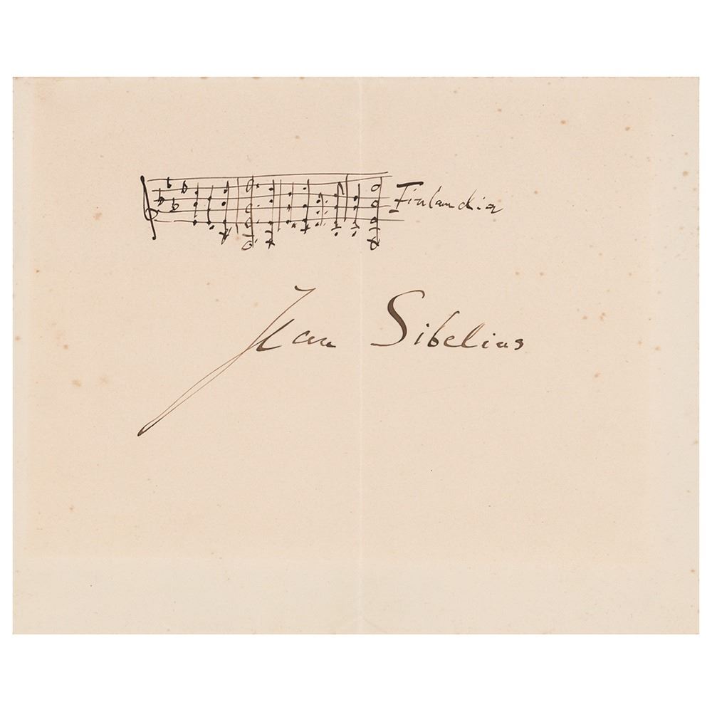 Scarce AMQS on an off-white 8 x 6.5 sheet, prominently signed below, "Jean Sibelius." Sibelius boldly pens a line from his most famous work, the tone poem "Finlandia." In fine condition, with scattered light foxing and a central vertical fold. A large and impressive autograph from the great Finnish composer, rare in this format.