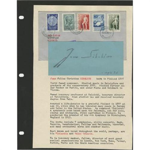 <B>Jean Sibelius Signature</B></I> on card, 5.5 x 2.5, mounted on sheet with a biographical sketch and the original transmission envelope. Sibelius (1865-1957) was a Finnish composer of classical music and one of the most notable composers of the late 19th and early 20th centuries. His music played an important role in the formation of the Finnish national identity. In addition to his symphonies, Sibelius' best-known composition is <I>Finlandia.</B></I> Very fine. <BR><BR><b>Shipping:</b> Flat Material, Small (<a target="_blank" href="http://www.heritageauctions.com/common/shipping.php">view shipping information</a>)