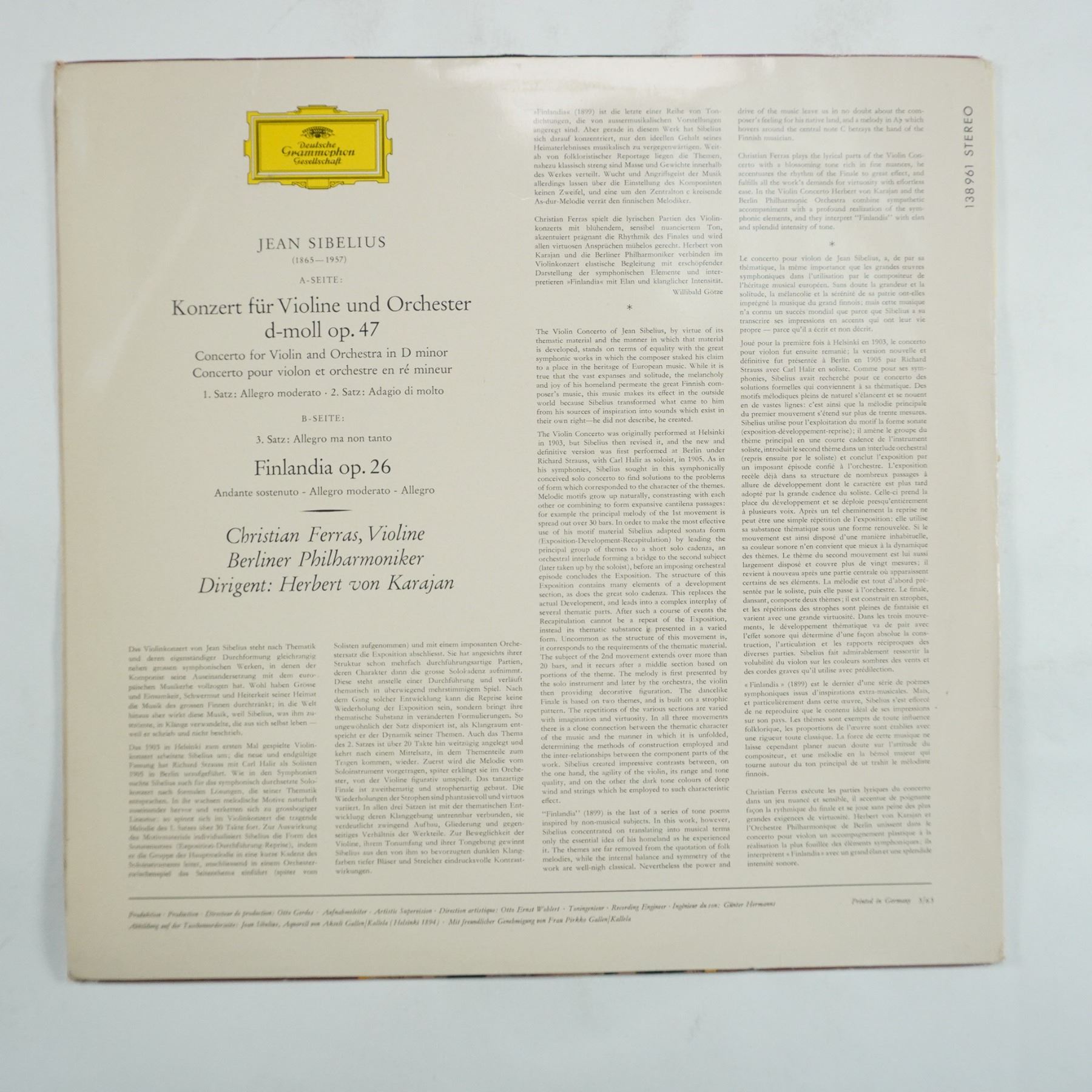 This vintage Deutsche Grammophon stereo LP features Jean Sibelius' Violin Concerto in D minor, Op. 47 and Finlandia, Op. 26, performed by Christian Ferras on violin, accompanied by the Berlin Philharmonic Orchestra under the direction of Herbert von Karajan. The record, catalog number 138 961, is a sought-after classical recording, celebrated for its expressive interpretation and technical mastery.