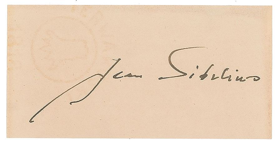 Distinguished Finnish composer (1865–1957) of Romantic-nationalistic tendencies, best known for his seven completed symphonies and the tone poem Finlandia. Fountain pen signature, "Jean Sibelius,” on an off-white 4.5 x 2.25 slip. In fine condition, with a prominent watermark touching the first letter of the signature.