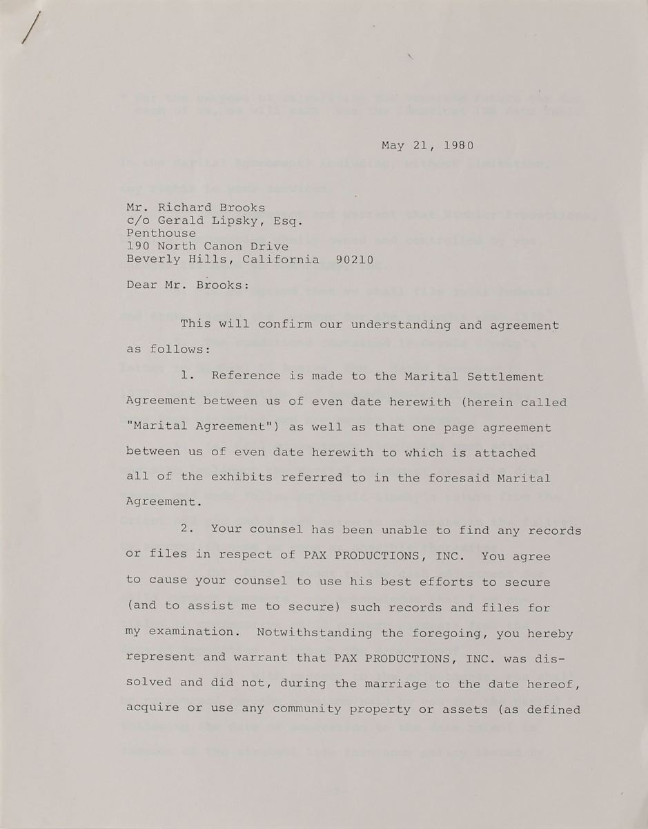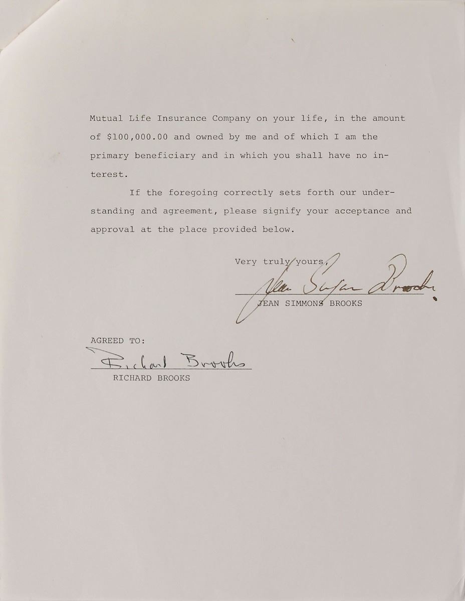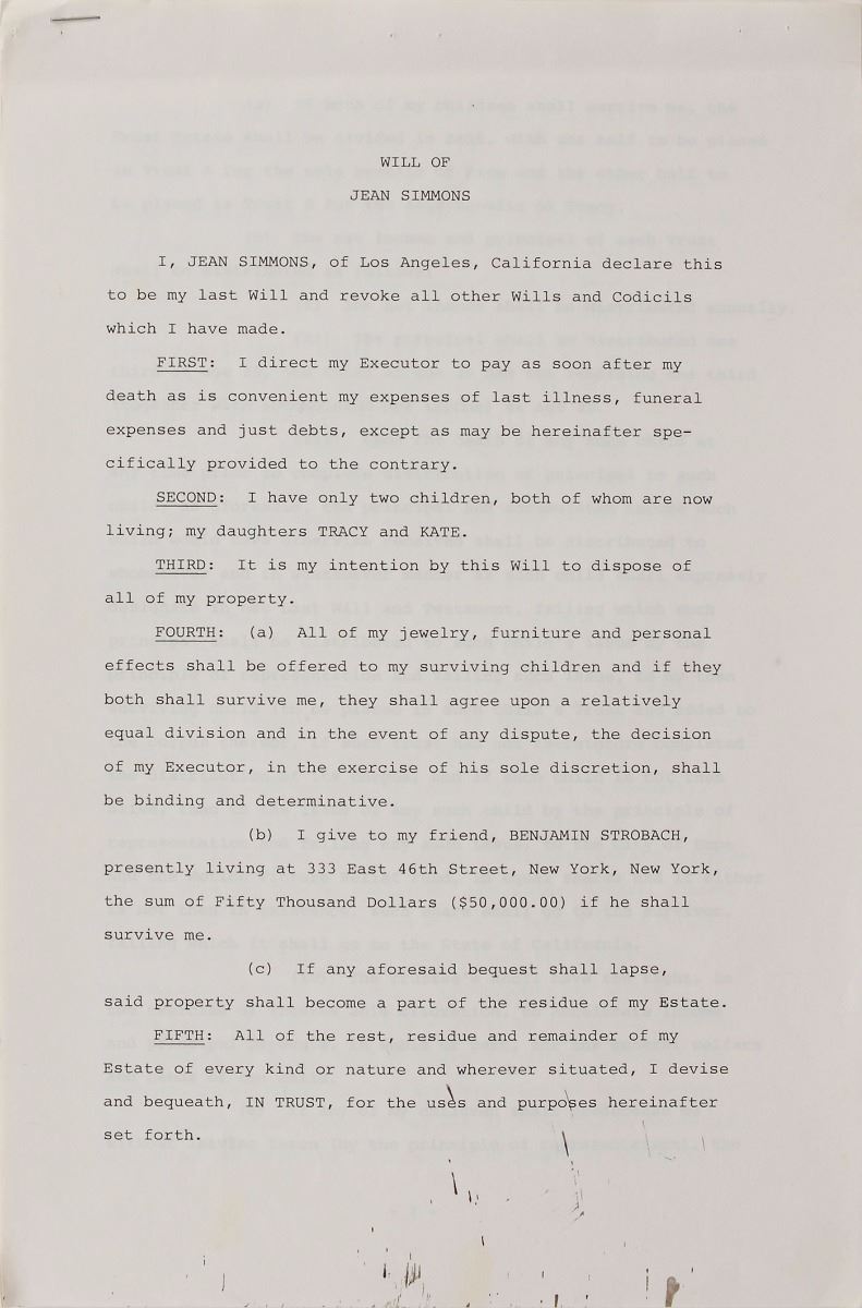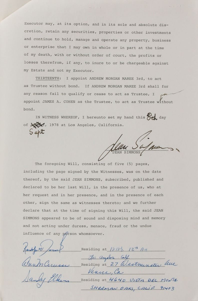 Two DSs: a marital settlement agreement concerning Pax Productions and her former husband, screenwriter Richard Brooks, three pages, dated May 21, 1980, signed at the conclusion in black ink, “Jean Simmons Brooks”; and the will of Jean Simmons, five pages, dated September 8, 1978, signed at the conclusion in black ink, “Jean Simmons.” In overall fine condition.