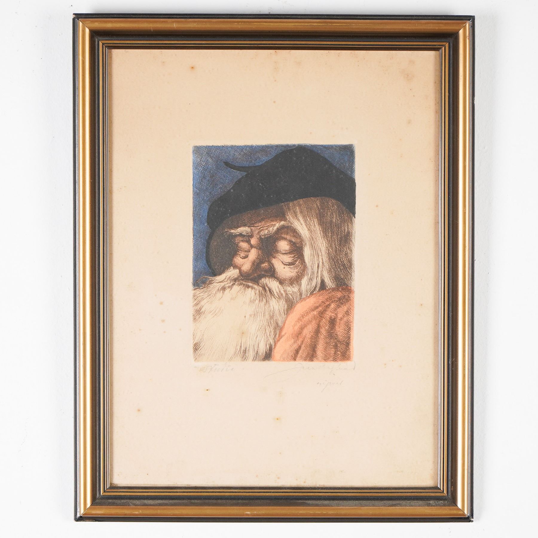 Framed etching by Swedish artist Jean Skoglund (1908-1948), depicting a bearded man in a dark cap with closed eyes, rendered in fine lines and soft color. Signed by the artist in pencil in the lower margin, indicating this is a hand-pulled print. Skoglund was known for his expressive portraiture and printmaking. The etching is matted and housed in a black and gold-toned frame with wire backing. Visible foxing on the mat and print, consistent with age.