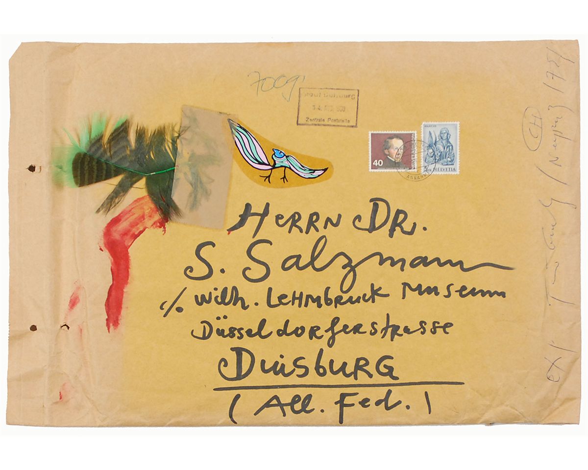 Swiss painter and sculptor (1925-1991) best known for his sculptural machines or kinetic art in the Dada tradition. Large mailing envelope, 15.5 x 10.5, addressed by Tinguely to art historian Siegfried Salzmann in Duisburg, postmarked August, 1980, with Tinguely adding a stroke of red paint, a green feather, a green sprig, and a sticker of a colorful bird in the upper left. In fine condition, with expected light handling wear. Salzmann was from, 1971 to 1984, Director of the Wilhelm Lehmbruck Museum in Duisburg, then, Director of the Kunsthalle Bremen. A one-of-a-kind example from one of the founders of art’s New Realism movement.