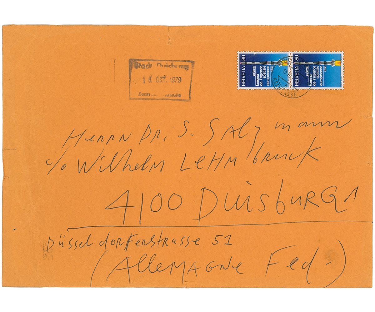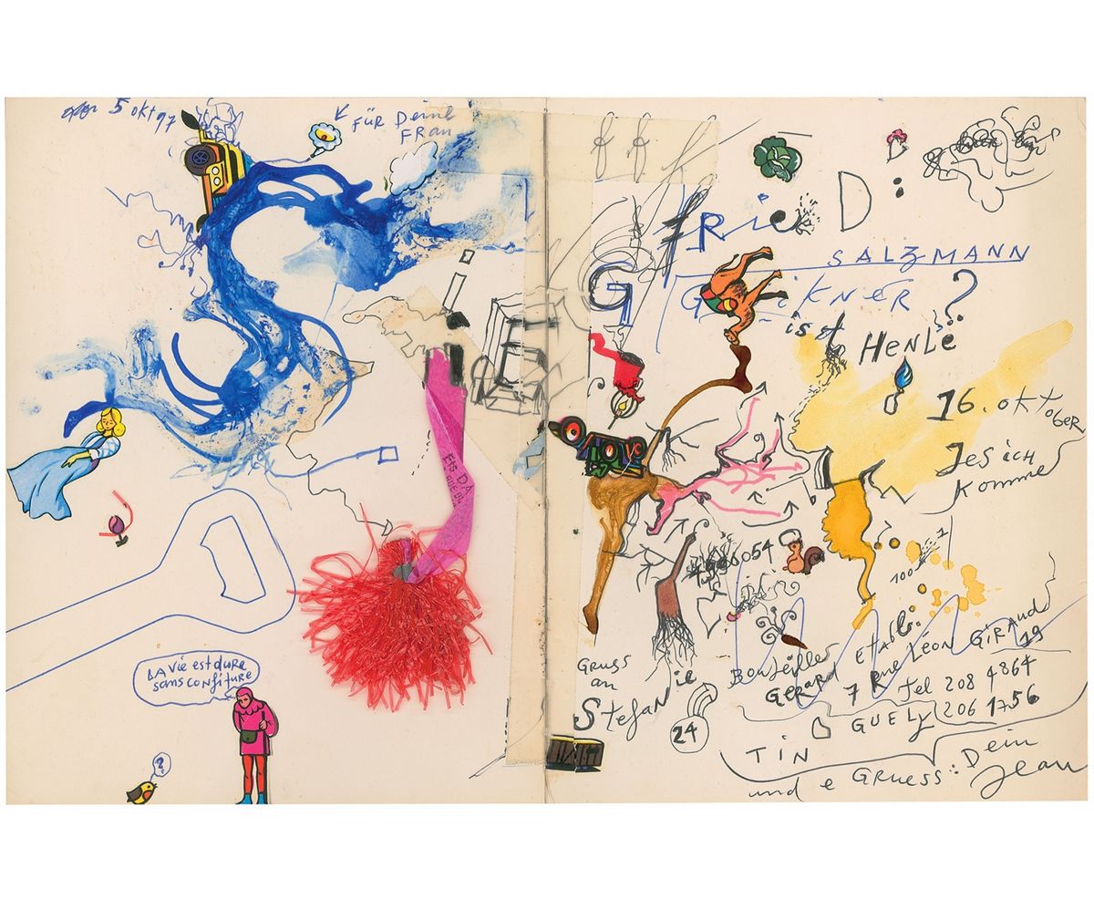 Swiss painter and sculptor (1925-1991) best known for his sculptural machines or kinetic art in the Dada tradition. ANS in German, signed “Dein Jean,” on two taped-together off white cards with an overall size of 12.5 x 8.25, October 5, 1979. Short note to art historian Siegfried Salmann telling him of his arrival. Tinguely has transformed the note into an original work of art incorporating strokes of paint, several stickers, small doodles and sketches, and a taped-on streamer. In fine condition. Accompanied by the original mailing envelope. A desirable, albeit bizarre, graphic from one of the founders of art’s New Realism movement.