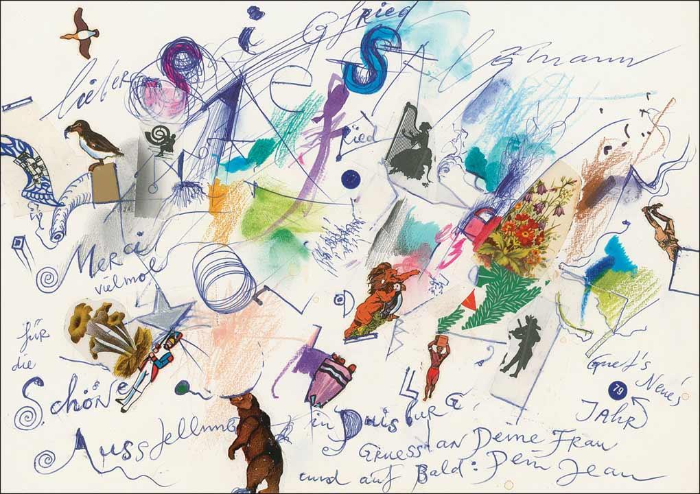 Swiss painter and sculptor (1925-1991). He is best known for his sculptural machines or kinetic art, in the Dada tradition. Interesting, vibrant and one-of-a-kind colored ink and crayon artwork, highlighted with stickers of birds, animals, and people, on an off-white 11.5 x 8.25 card, inscribed at the bottom in German, signed “Dein Jean,” and dated July 20, 1979. In fine condition, with a mild diagonal crease through portion of inscription, and a few light spots and brushes, seemingly intentionally done by Tinguely.