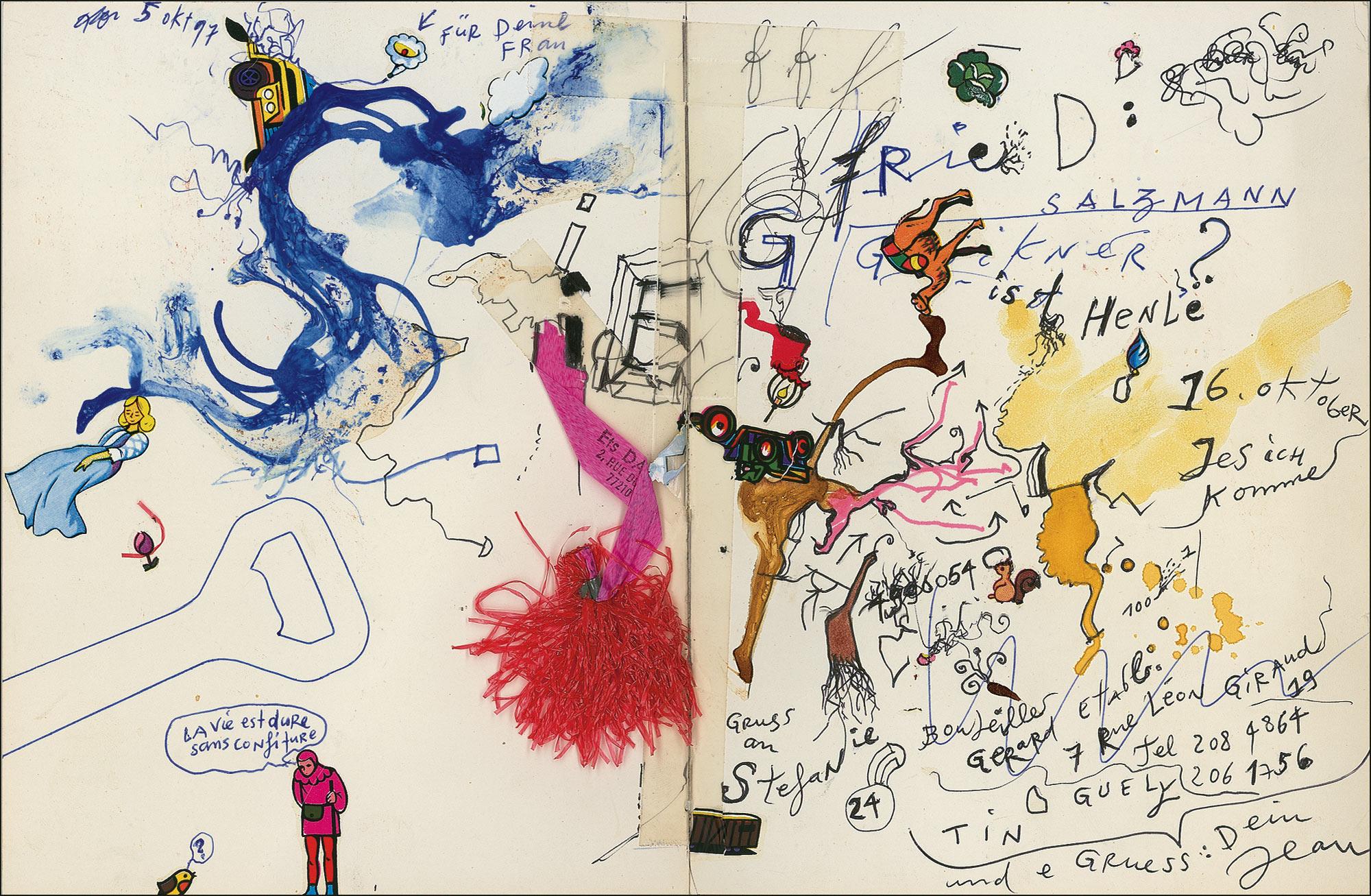 Swiss painter and sculptor (1925-1991). He is best known for his sculptural machines or kinetic art, in the Dada tradition. Vibrant original mixed media graphic art by Tinguely on two off-white 6.25 x 8.25 postcards, joined together by a vertical strip of tape, signed at the bottom, “Jean” and “Tinguely.” Tinguely uses watercolors, ink, a ribbon and tassle, and stickers for his work. The art historian Siegfried Salzmann with the message of his coming. In fine condition, with some light handling wear and aforementioned tape to center. Accompanied by the original mailing envelope.