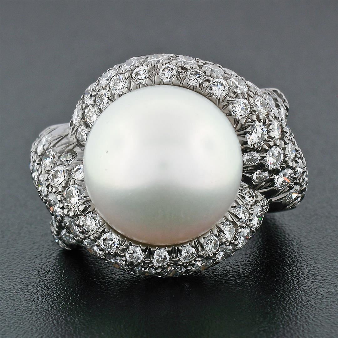 A solid 18k black gold bypass ring by Jean Vitau, with 1 round shape cultured pearl (AAA Quality; 13.43mm), surrounded with 99 round brilliant cut natural diamonds (E/F - VVS2/VS1; 3.18ctw). The ring is size 6.0, weighs a total of 14.66 grams, and measures 19.08mm wide.