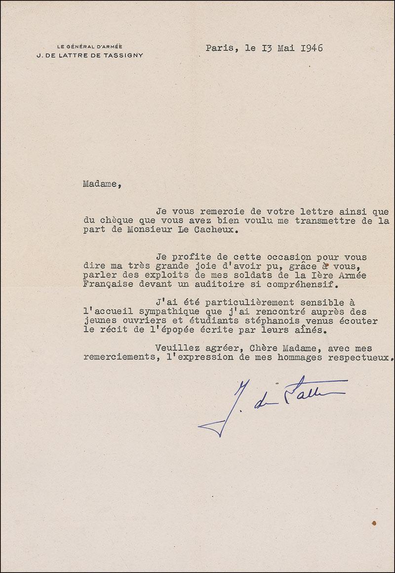 French military hero of World War II and commander in the Indochina War (1889-1952). TLS in French, signed “J. de Lattre,” one page, 7.25 x 10.5, Le General D’Armee letterhead, May 13, 1946. Letter to a woman, in part: “Thanks for your letter and for the check … I was very pleased—thanks to you—to speak about exploits of my soldiers of my 1st Army.” Signed at the conclusion in purple ink. In fine condition, with bisecting folds, and a couple small creases. RRAuction COA.