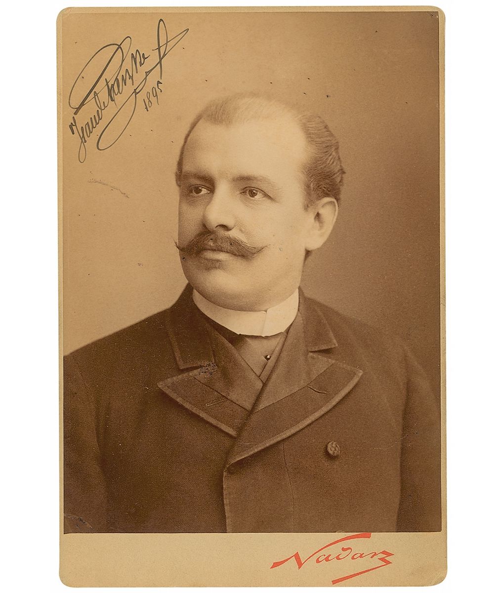 Polish tenor (1850–1925) who was the biggest male opera star of the late 19th century. Original 4.25 x 6.5 cabinet photo by Nadar of Paris, signed in the upper left corner of the image in black ink, “Jean de Reszke 1895.” In fine condition, with a couple trivial corner tip dings and a few scattered marks to image.