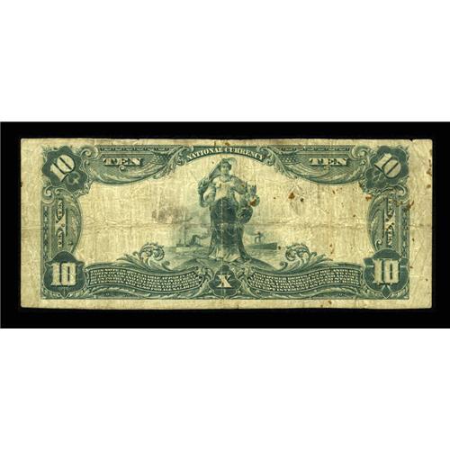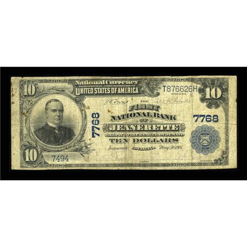 <B>Jeanerette, LA</B></I> - $10 1902 Plain Back Fr. 624 <B>The First NB</B></I> Ch. # 7768<BR>This newly discovered $10 raises the census to eleven for this one national bank town in Iberia Parish. The signatures have faded and there is some scattered staining on the face and back. We have sold two notes on this bank in the past, the last one being in 2000. <B>Very Good.</B></I><BR><BR><b>Shipping:</b> Coins & Currency (<a target="_blank" href="http://www.heritageauctions.com/common/shipping.php">view shipping information</a>)