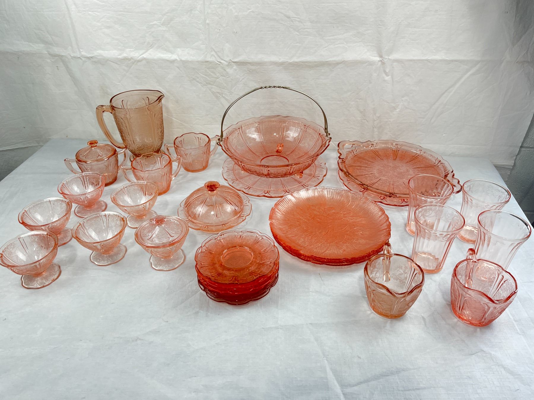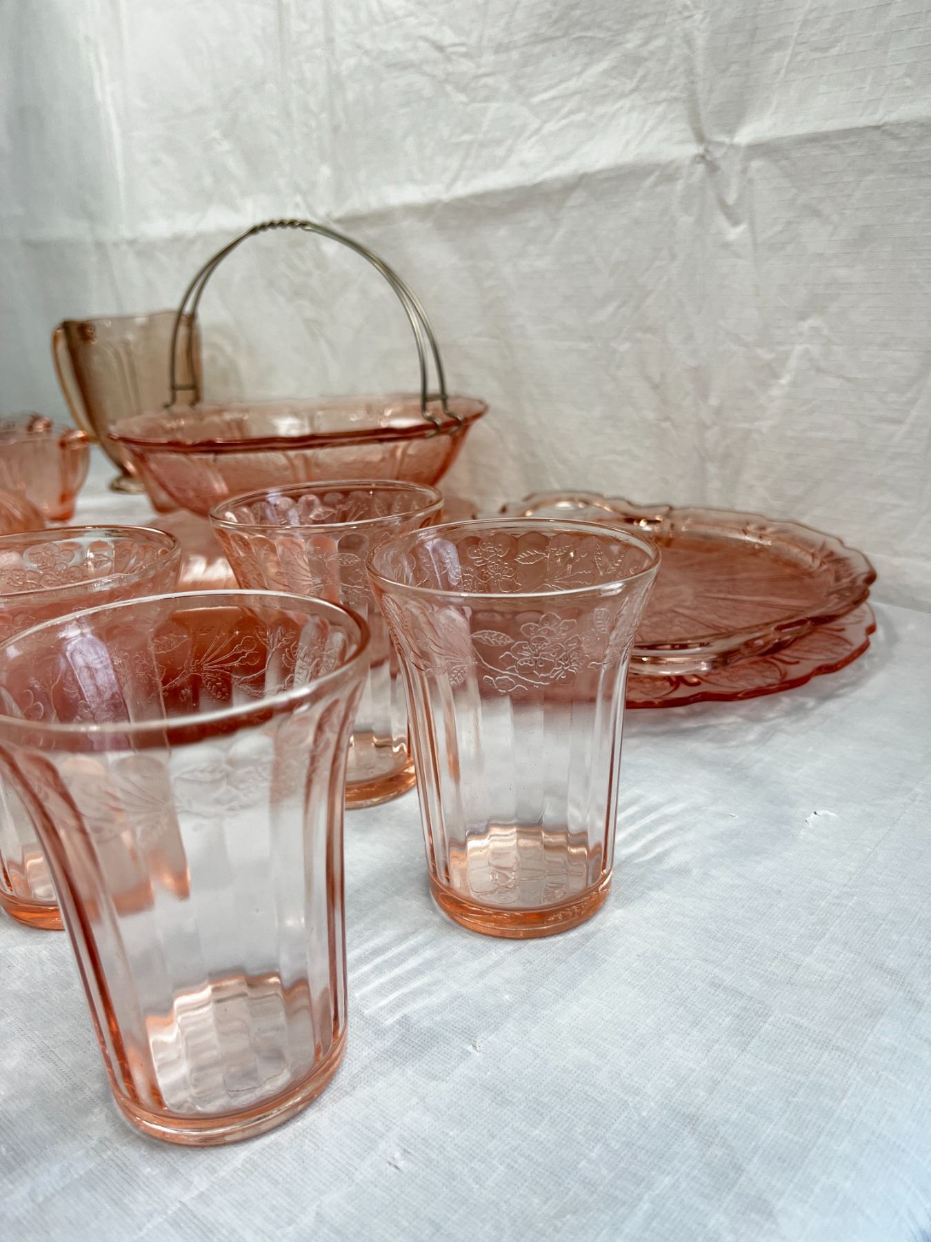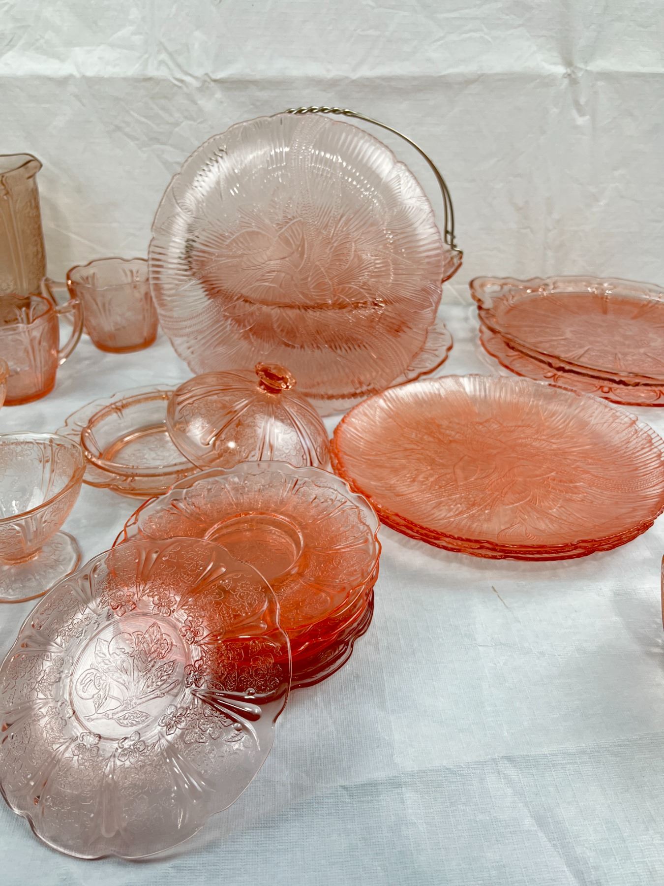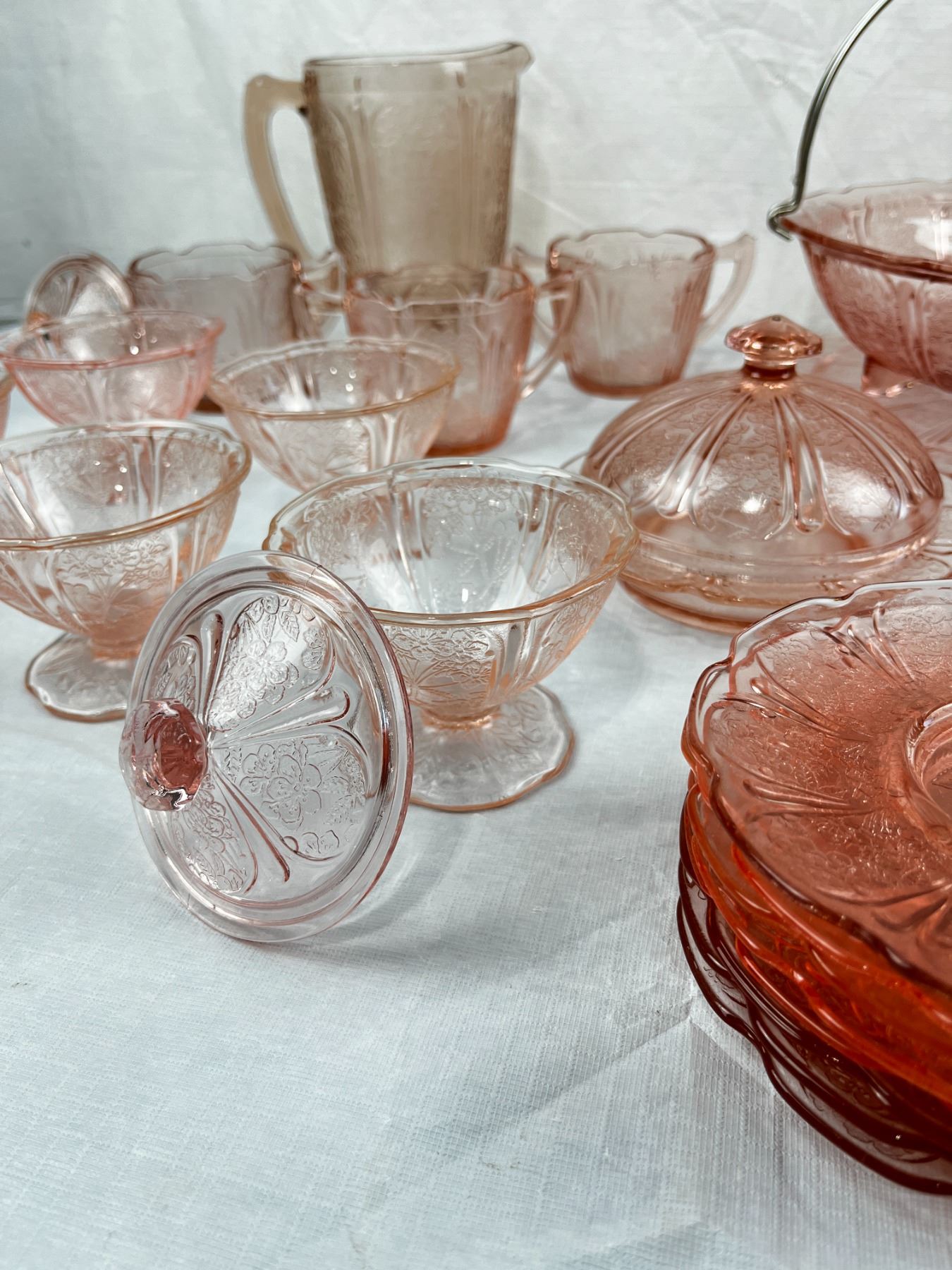 4 large plates, 8 saucers, 6 dessert cups including serving dishes/trays, cups, pitchers etc - One cup has a chip