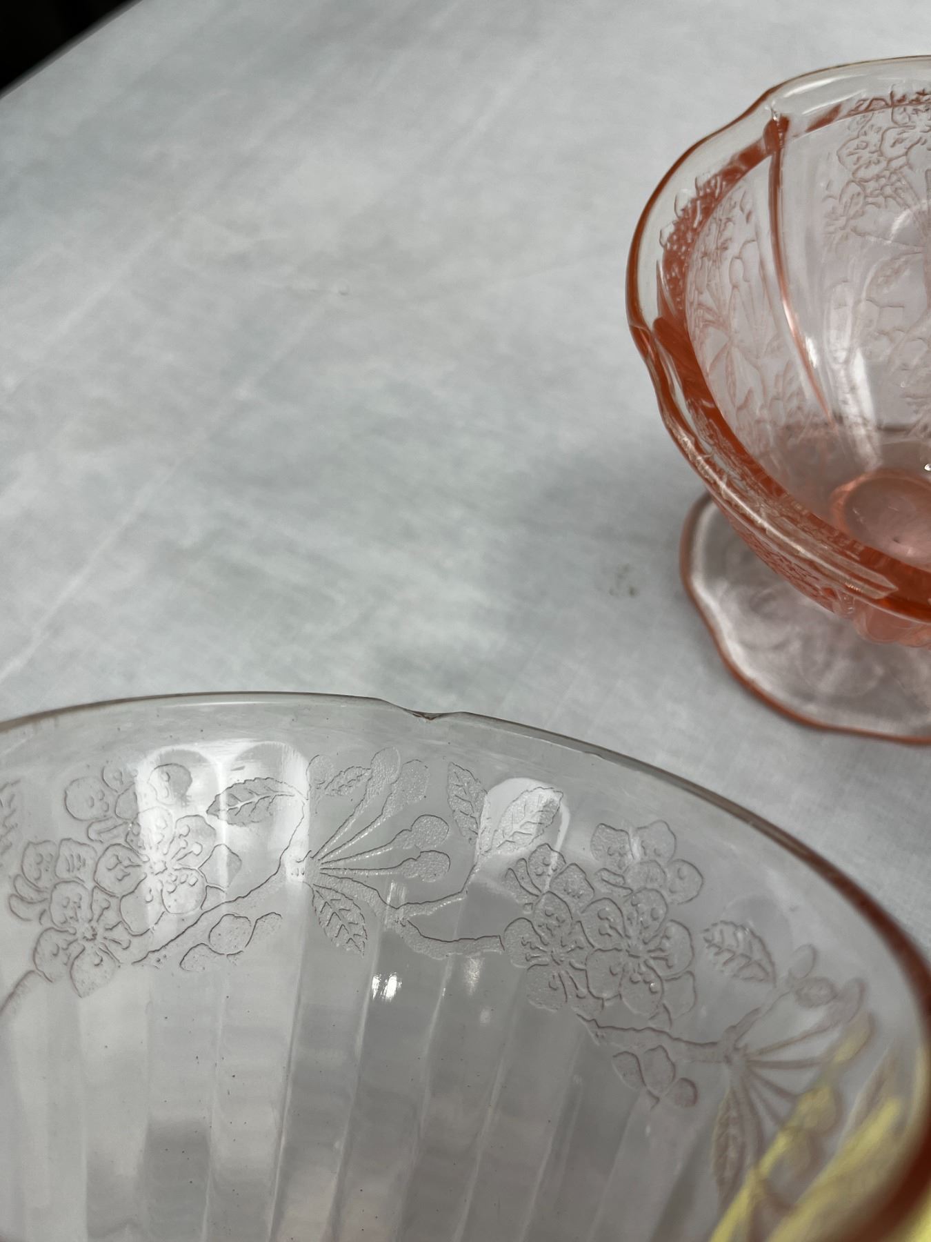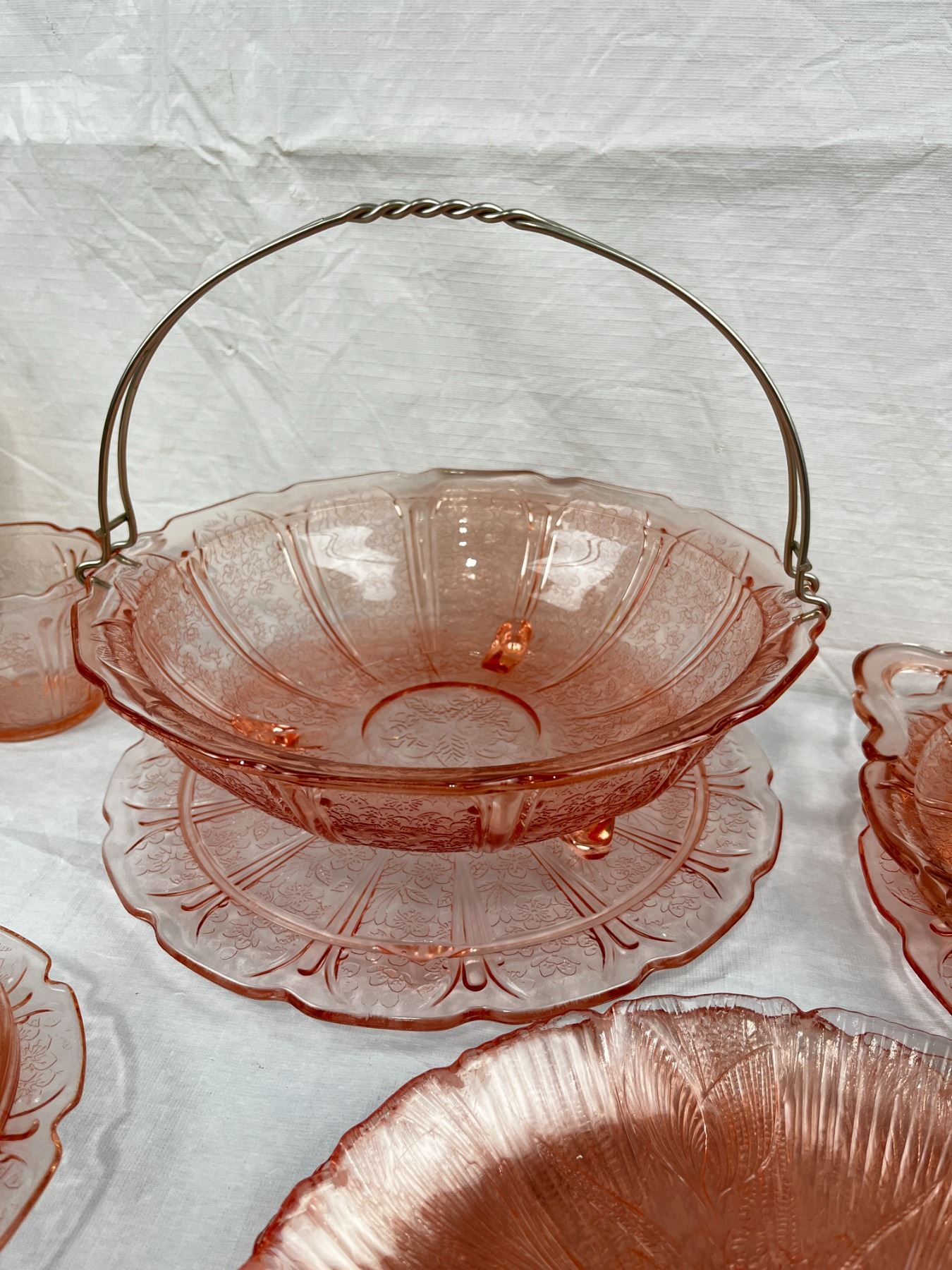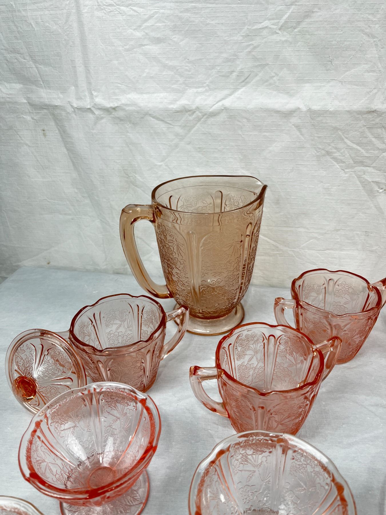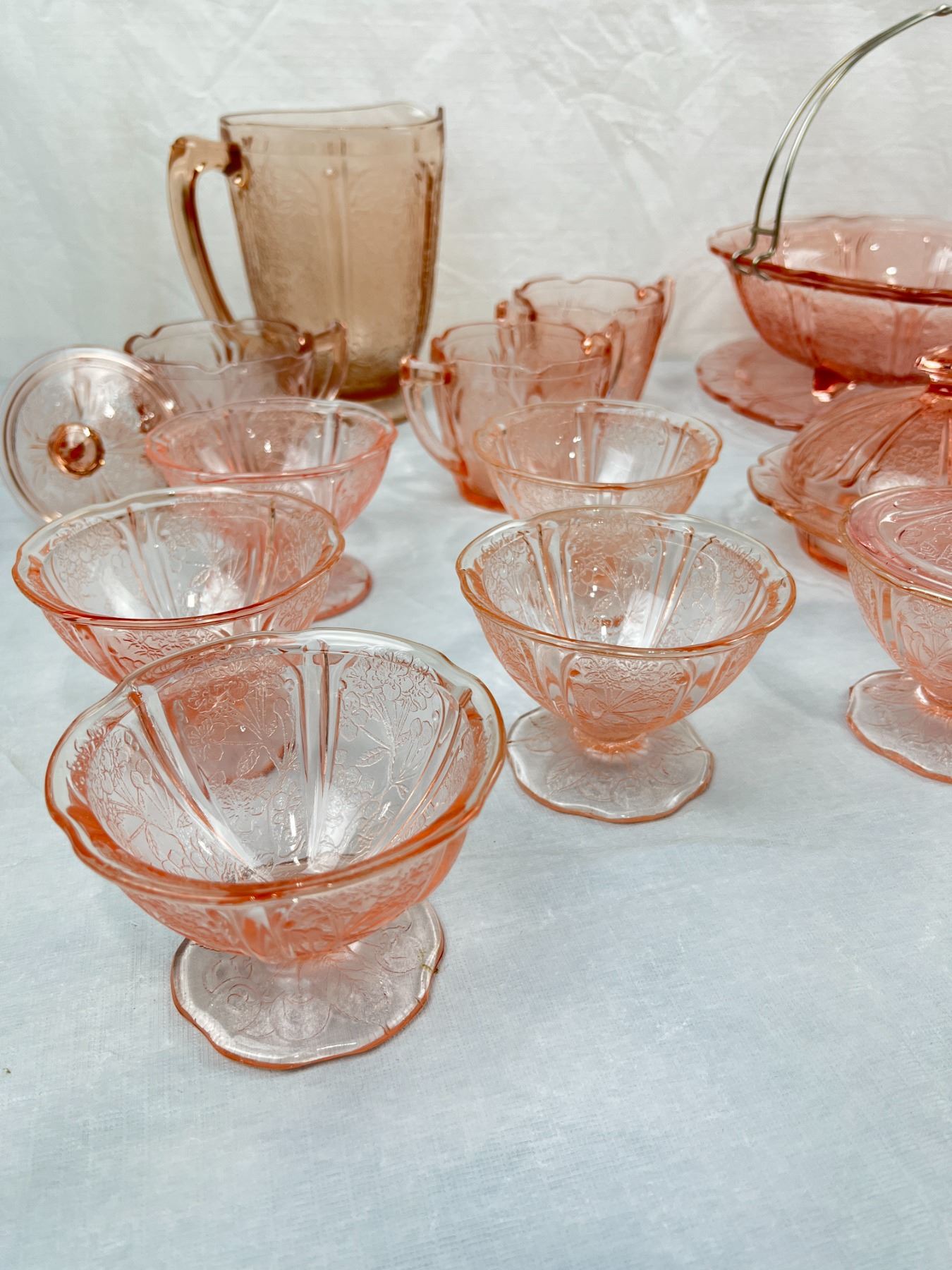 4 large plates, 8 saucers, 6 dessert cups including serving dishes/trays, cups, pitchers etc - One cup has a chip