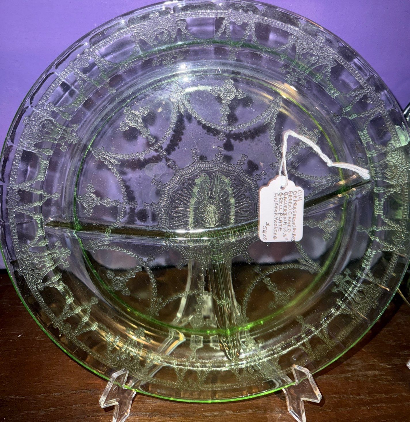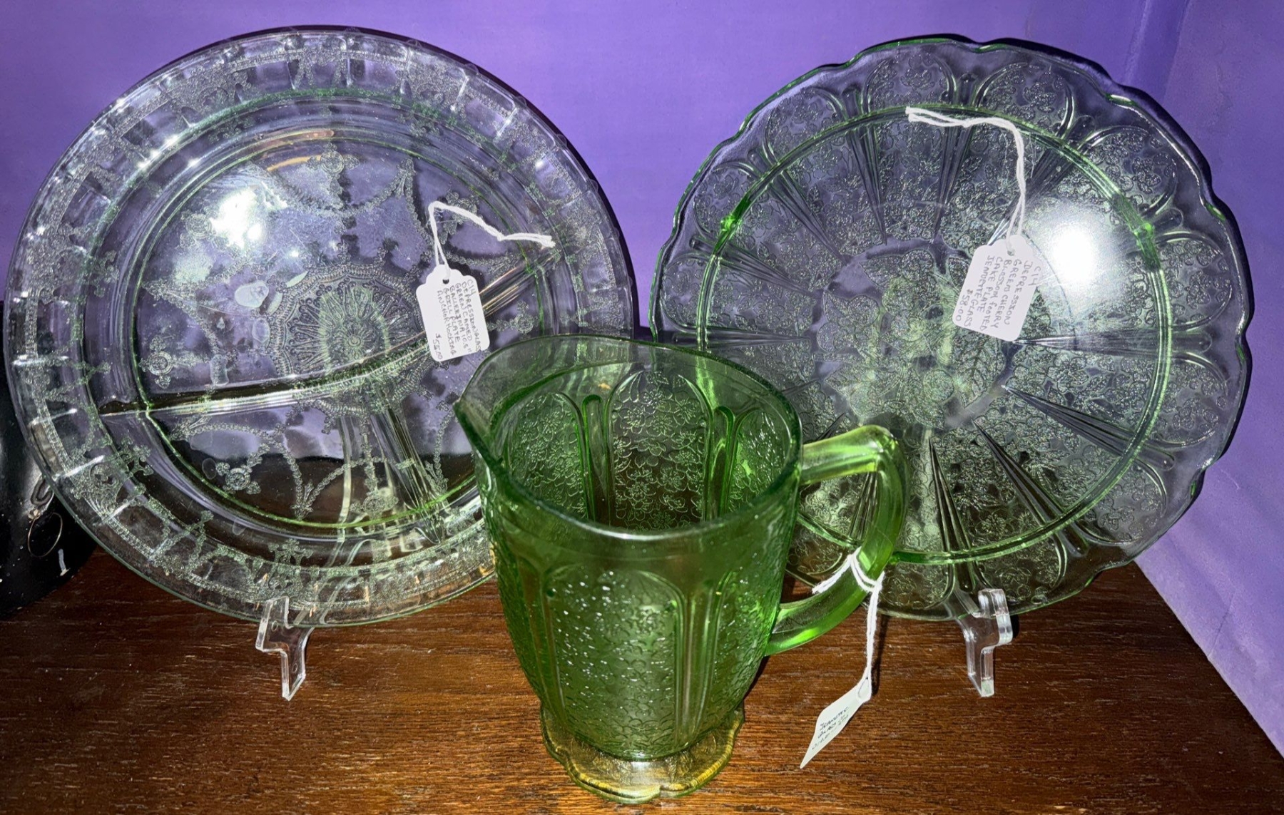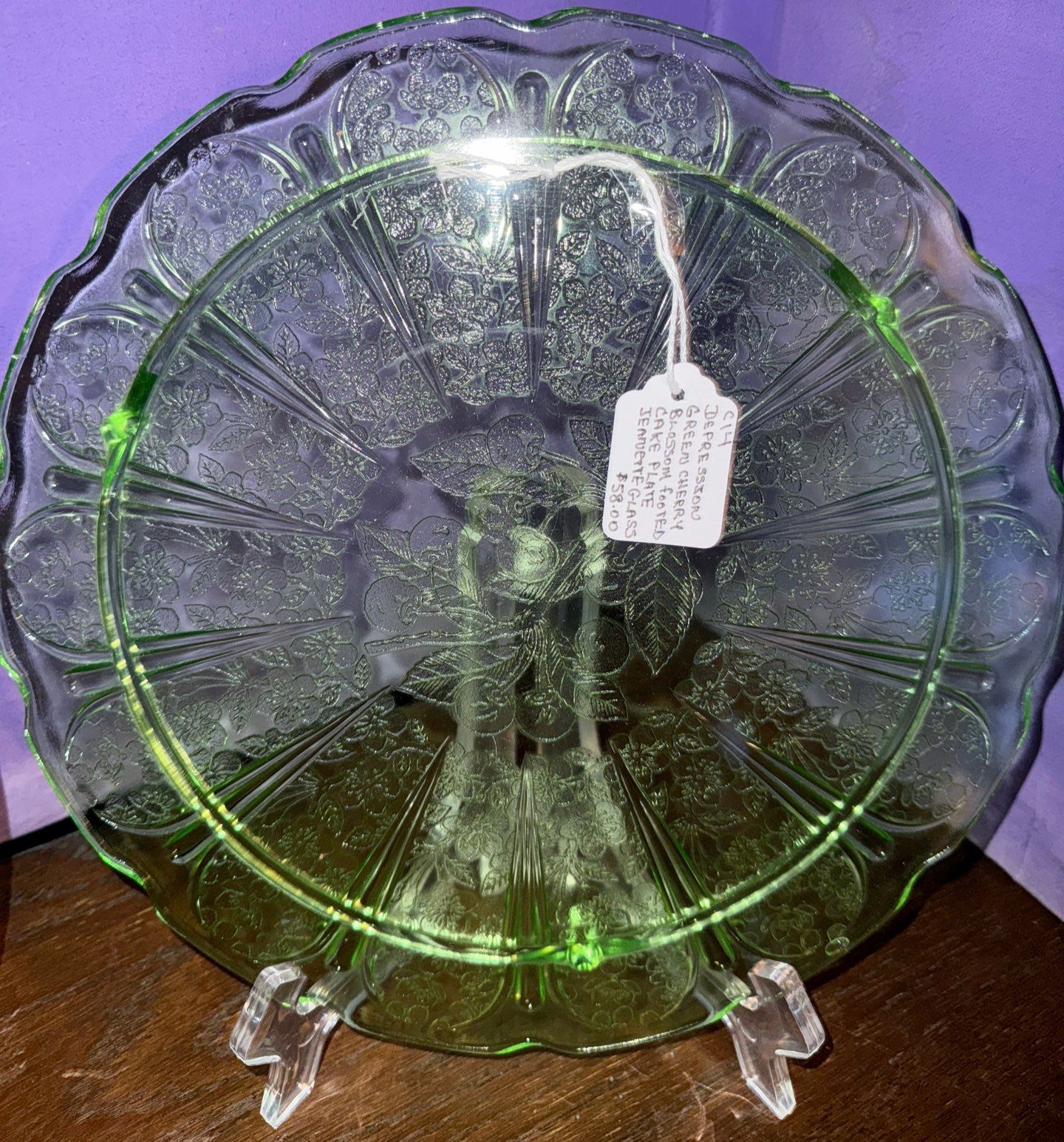 Jeanette Glass Co Green Depression Cherry Blossom Footed Cake Plate, Green Depression Glass Jug, ++ One Ballerina Grill Plate