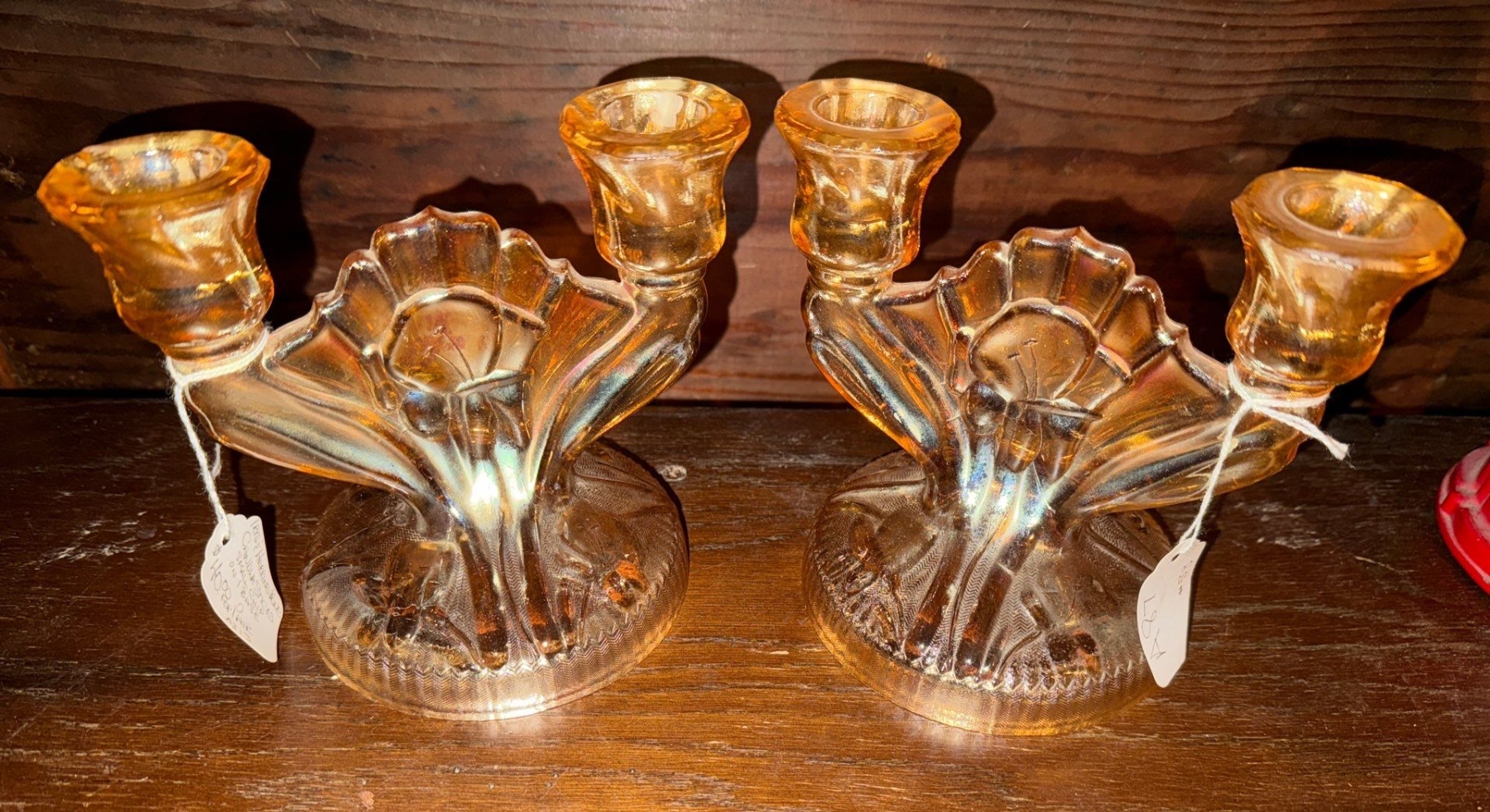Jeanette Glass Iris & Herringbone Carnival Glass Double Candle Holders Marigold-Peach