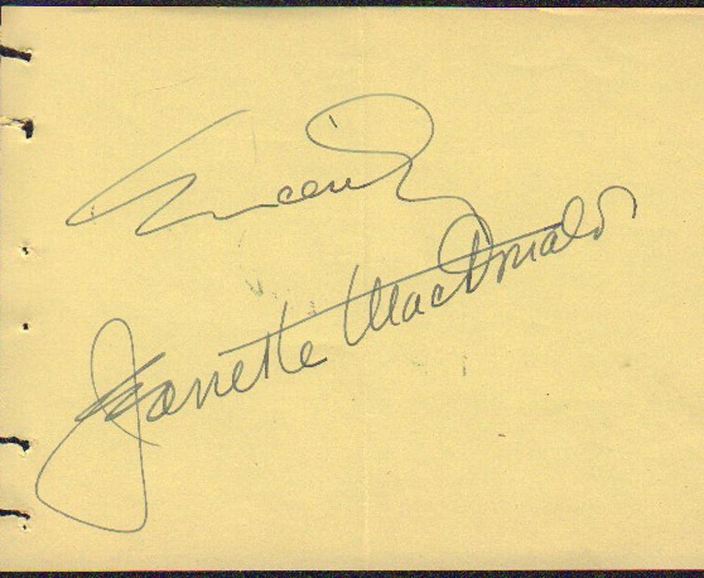Autograph book page signed by Jeanette MacDonald. The page had been folded in half at some point. All items come with a certificate of authenticity good for the life of the piece.