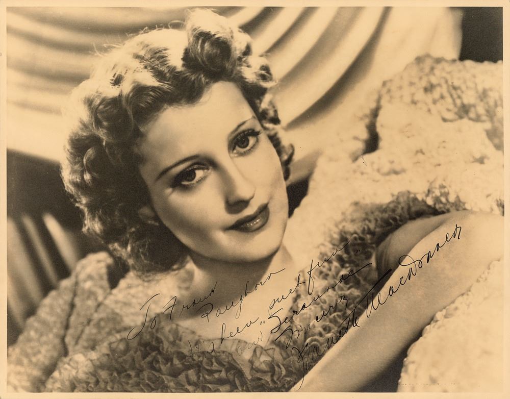 Vintage matte-finish 14 x 11 close-up photo of the popular singer and actress, signed and inscribed in fountain pen to a fellow actor, "To Frank Pangborn, It's been such fun, our 'Seranade,' Sincerely, Jeanette MacDonald." In fine condition.