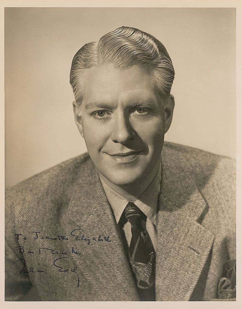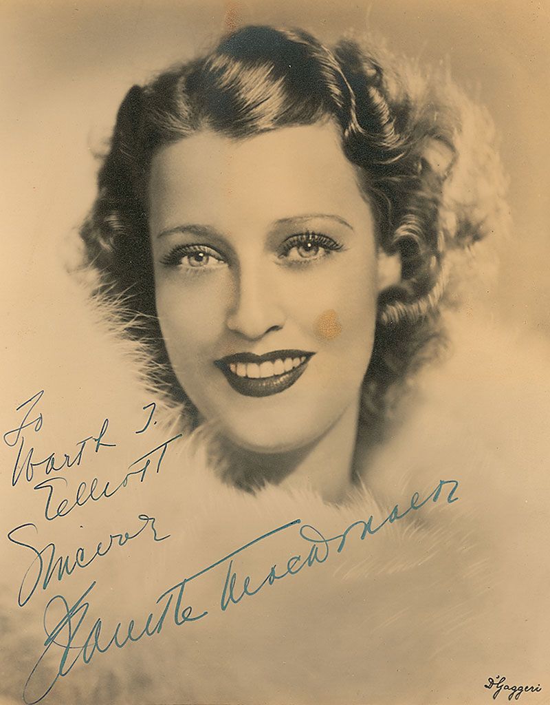 Vintage matte-finish 7.25 x 9.25 bust portrait of MacDonald, signed and inscribed in fountain pen, “To Worth J. Elliott, Sincerely, Jeanette MacDonald”; and a vintage matte-finish 8 x 10 portrait of Eddy, signed and inscribed in fountain pen, “To Jeanette Elizabeth, Best wishes, Nelson Eddy.” A prominent stain to MacDonald’s cheek and trimmed edges to her photo, otherwise overall fine condition.