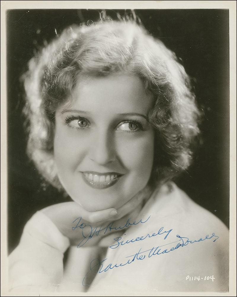 Vintage double-weight pearl-finish 8 x 10 photo of a young MacDonald resting her chin in her hands, signed and inscribed in blue fountain pen “To J. H. Huber, Sincerely, Jeanette MacDonald.” In fine condition, with scattered light surface impressions and a few trivial corner dings.
