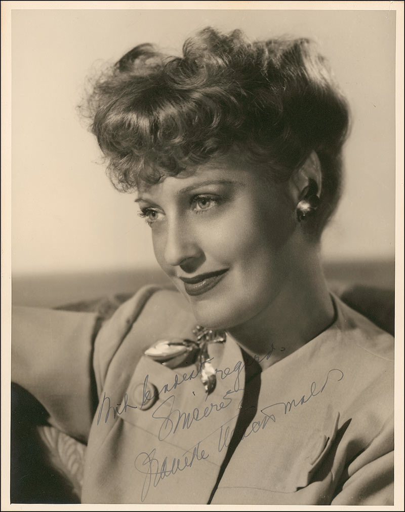 Soft vintage matte-finish 11 x 14 photo of MacDonald, signed in fountain pen, “With kindest regards, Sincerely, Jeanette MacDonald.” In fine condition, with light toning to the top edge, along with a small tear.