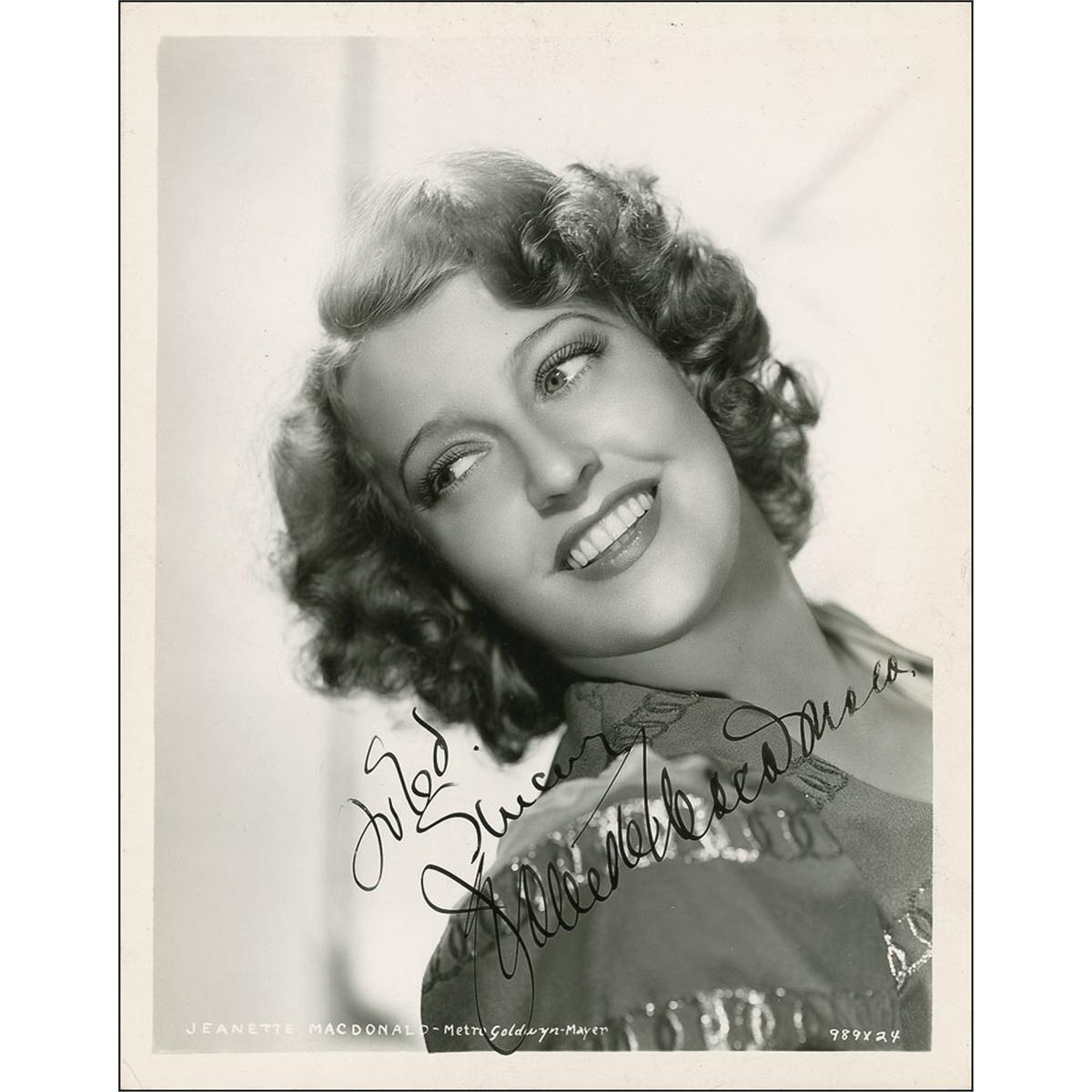 Radiant vintage pearl-finish 8 x 10 MGM publicity photo, signed and inscribed in fountain pen “To Ted, Sincerely, Jeanette MacDonald.” In fine condition, with some light edge and corner creases, a few surface marks, and a bit of trivial surface loss along right edge.