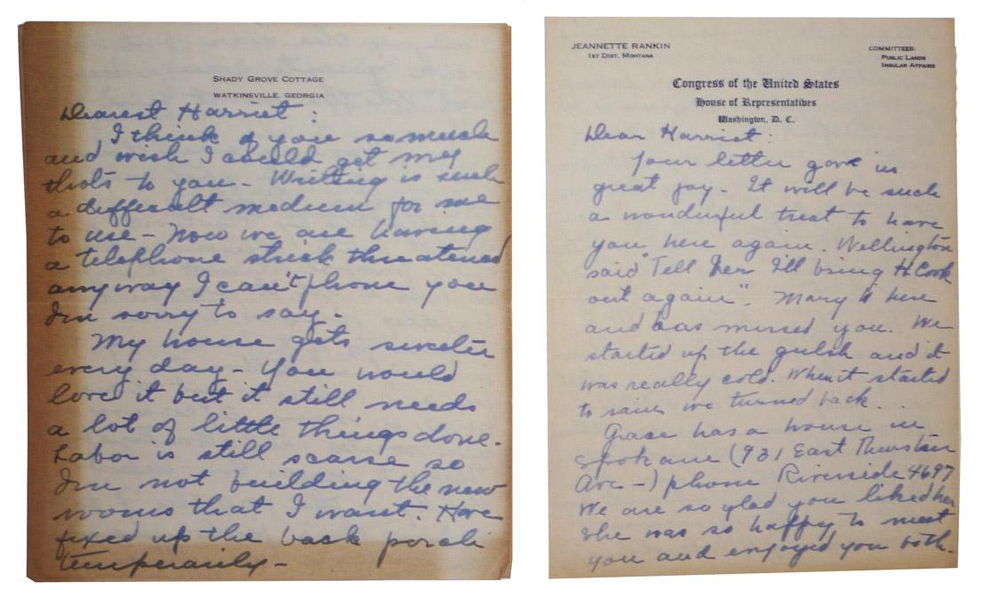 Two letters signed by Jeanette Rankin, first elected Congresswoman and dedicated pacifist. Written to her friend, Harriet Yarrow, first letter is on personal stationery of Rankin's farm. Second letter is written on formal Congress of the United States letterhead dated 28 August 1944. Thoughts upon Roosevelt, Gandhi, and more. Letters both measure approximately 6'' x 7''. Some discoloration to edges, else good condition.