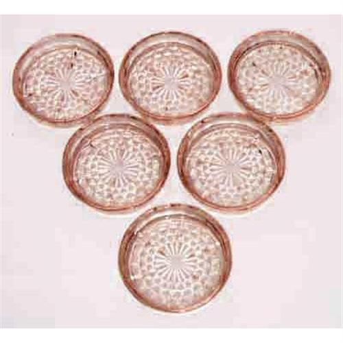The Jeannette Glass Co. produced their Cube or Cubist pattern during the years 1929-1933. Reminiscent of the Cubist slyle of painting by Braque and Piccaso earlier in the century this popular Art Deco design, as it's name implies, consists of rows of three dimentional cubes jutting out concentrically from the glass. This set of SIX gorgeous pink Depression Glass Cube or Cubist coasters by Jeannette have a diameter of 3 1/4 inches and are all in excellent condition.