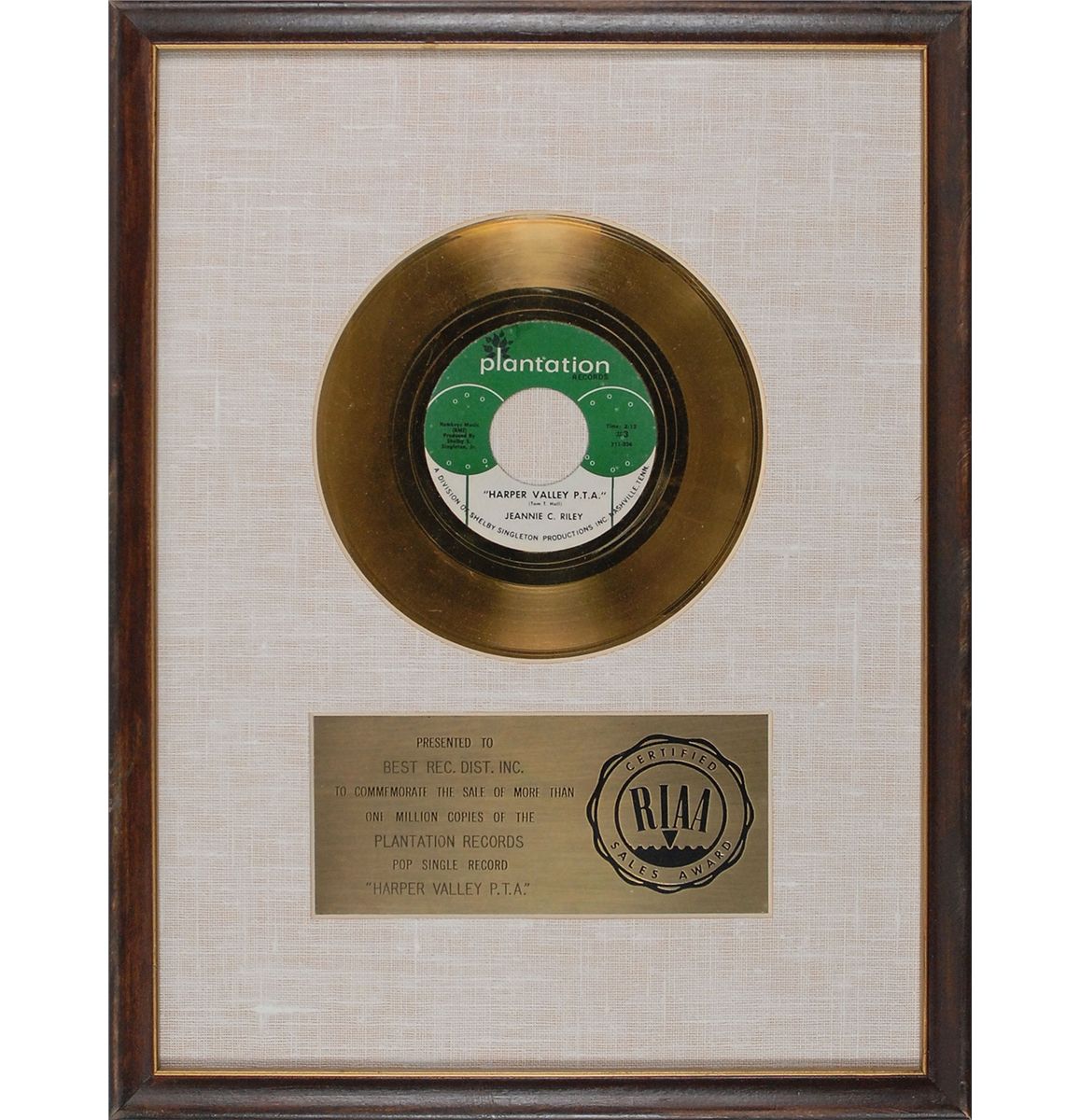 Original white-matte 45 gold record sales award presented to “Best Rec. Dist. Inc. to commemorate the sale of more than one million copies of the Plantation Records pop single record ‘Harper Valley P. T. A.’” Disc is framed with its presentation plaque to an overall size of 13.25 x 17.25. The backing has been replaced.